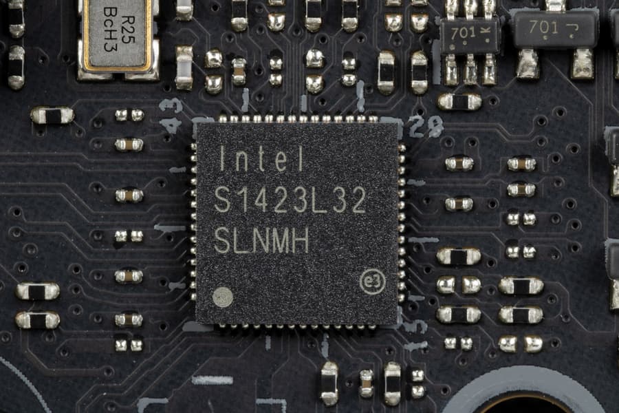 Материнская плата оснащена средствами связи хорошо. Имеется скоростной Ethernet-контроллер Intel I225-V, способный работать по стандарту 2,5 Гбит/с.