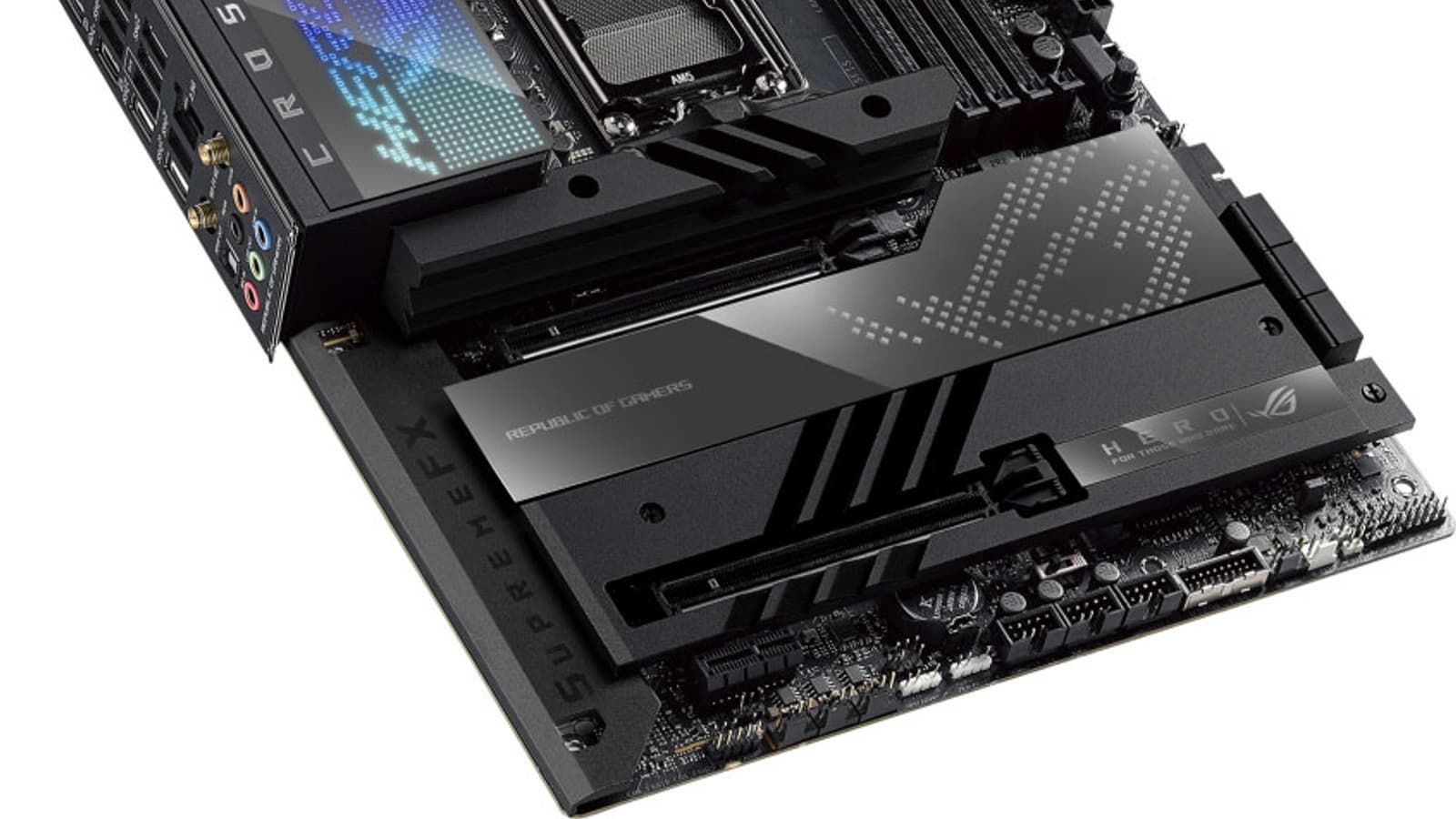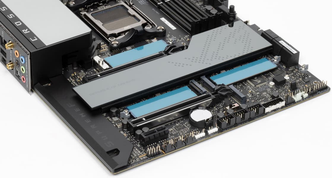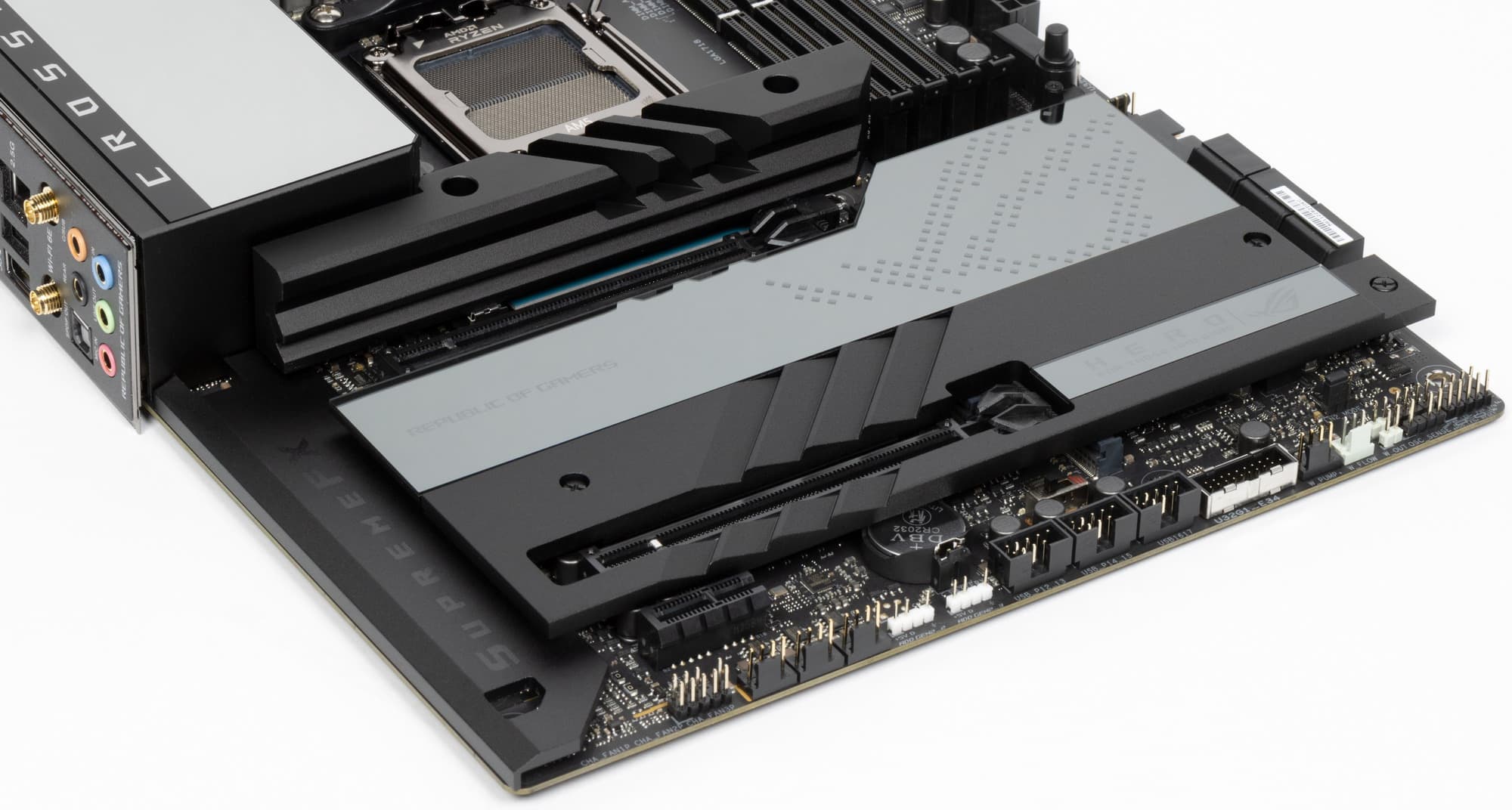 У платы 5 слотов M.2: четыре расположены на текстолите, два из них подключены напрямую к процессору линиями PCIe 5.0, два других подключены к чипсету X670E линиями PCIe 4.0, а пятый слот М.2 находится на карте расширения ROG PCIe 5.0 M.2, которую можно установить в один из двух слотов PCIe x16 (но при этом видеокарте достанется уже только 8 линий PCIe). То есть в плане поддержки самых современных и скоростных накопителей данная плата почти не имеет себе равных: можно установить три SSD с интерфейсом PCIe 5.0. Правда, скоростные SSD могут сильно нагреваться, и штатных радиаторов материнской платы может не хватить, но это уже отдельный вопрос.