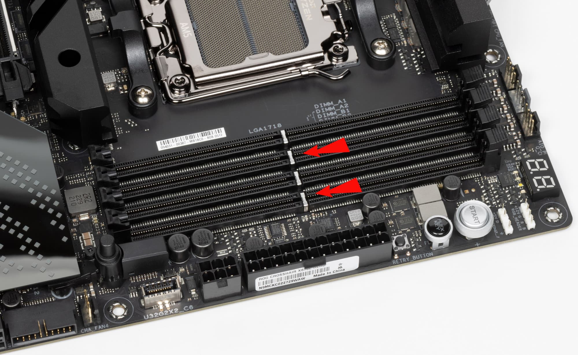 Для установки модулей памяти на плате имеется четыре DIMM-слота (для работы памяти в Dual Channel в случае использования всего 2 модулей их следует устанавливать в А2 и B2). Плата поддерживает небуферизованную память DDR5, а максимальный объем памяти составляет 192 ГБ. Поддерживаются профили XMP и Expo, а также емкости модулей 24 и 48 ГБ (следует только обновить BIOS).