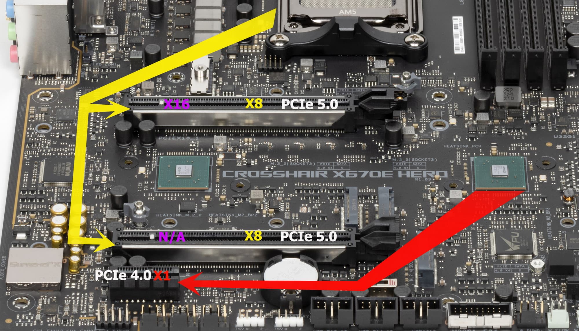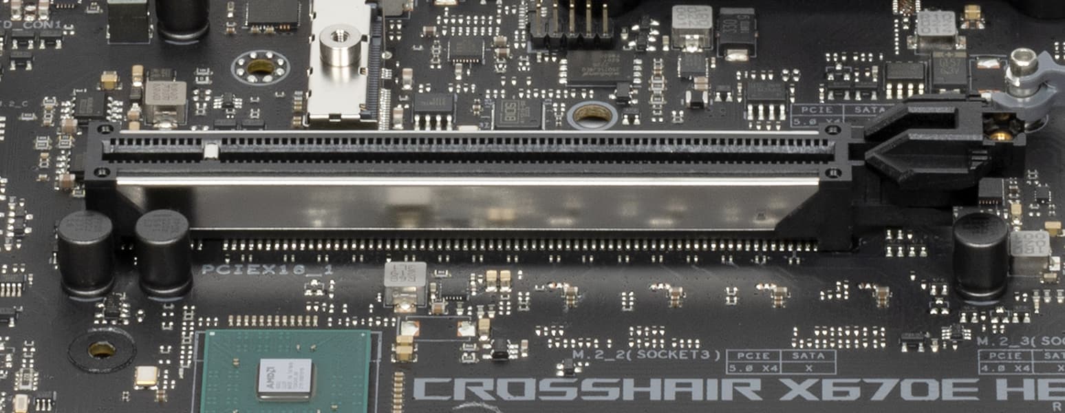 Всего на плате есть 3 слота: два PCIe x16 (для видеокарт или других устройств) и один PCIe x1. Если про первые два PCIe x16 я выше уже рассказал (они подключены к CPU), то PCIe x1 подключен к X670E.