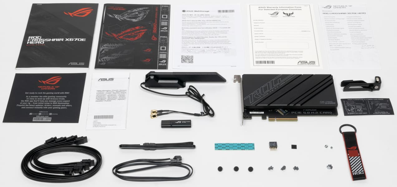Комплект поставки соответствует флагманскому продукту: кроме традиционных элементов типа руководства пользователя и кабелей SATA, имеются антенна встроенного Wi-Fi-модуля, держатели для М.2 слотов, разветвители для подключения подсветок, фирменный адаптер для передней панели, бонусные стикеры, накопитель типа «флешки», брелок, подставка для видеокарты и ROG PCIe 5.0 M.2 card.