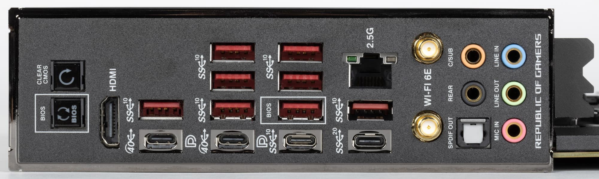 | Разъемы на задней панели | 3 × USB 3.2 Gen2 (Type-C) 8 × USB 3.2 Gen2 (Type-A) 1 × USB 3.2 Gen2x2 (Type-C) 1 × RJ-45 5 аудиоразъемов типа миниджек 1 × S/PDIF (оптический, выход) 1 × HDMI 2.1 2 антенных разъема кнопка сброса CMOS кнопка перепрошивки BIOS — Flashback |