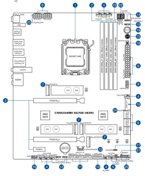 Форм-фактор ATX имеет размеры до 305×244 мм, а E-ATX — до 305×330 мм. Материнская плата Asus ROG Crosshair X670E Hero имеет размеры 305×244 мм, поэтому выполнена в форм-факторе ATX, и на ней имеются 9 монтажных отверстий для установки в корпус. Однако следует иметь в виду, что одно из девяти монтажных отверстий перекрыто радиатором для слота M.2.