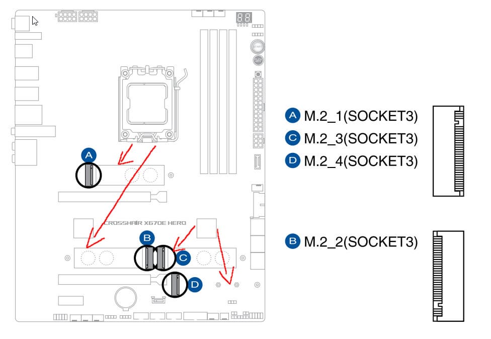 Третий и четвертый слоты M.2 (M2_3, M2_4) получают данные от чипсета X670E (PCIe 4.0), а первые два — от CPU (PCIe 5.0). При этом все слоты работают с модулями только с PCIe интерфейсом и поддерживают размеры модулей: 2242/2260/2280. На всех M.2 можно организовать RAID.