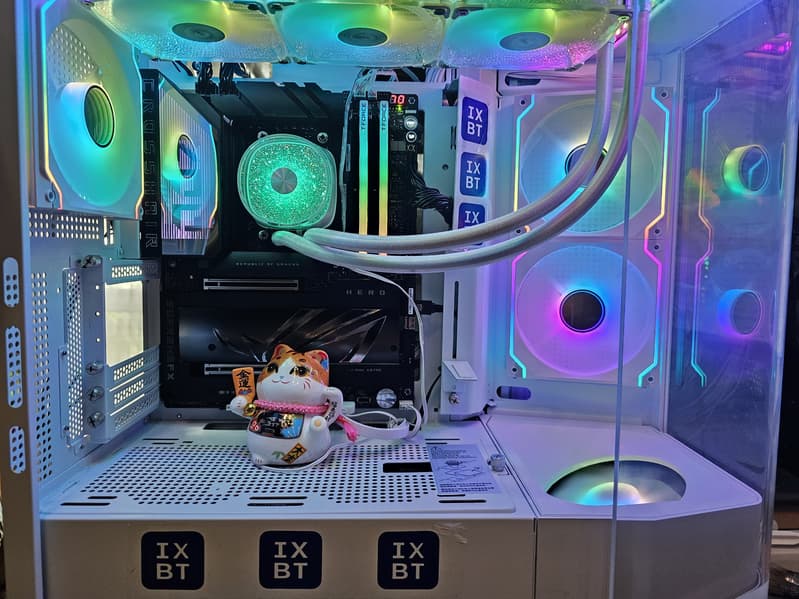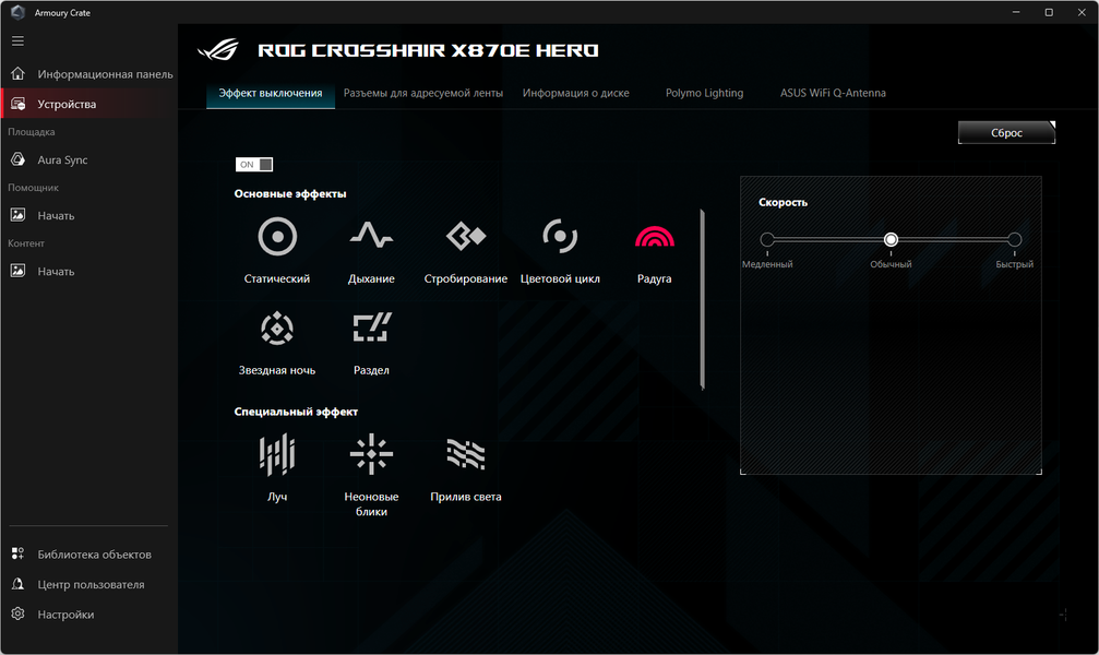 В арсенале платы также есть 4 порта SATA, порт SlimSAS и 8 разъемов для вентиляторов. Система питания процессора очень мощная, способная обеспечить работу любых совместимых процессоров с приличным запасом на разгон. Плата имеет грамотную систему охлаждения каждого потенциально греющегося элемента, включая накопители в слотах M.2 (термопрокладки для охлаждения накопителей в 3 слотах есть с обеих сторон). Сетевые возможности прекрасные: два быстрых проводных контроллера (5 и 2,5 Гбит/с) и один самый современный беспроводной — Wi-Fi 7 + Bluetooth 5.4. В числе плюсов платы можно упомянуть стильную подсветку, а также широкие возможности для подключения дополнительных RGB-устройств.