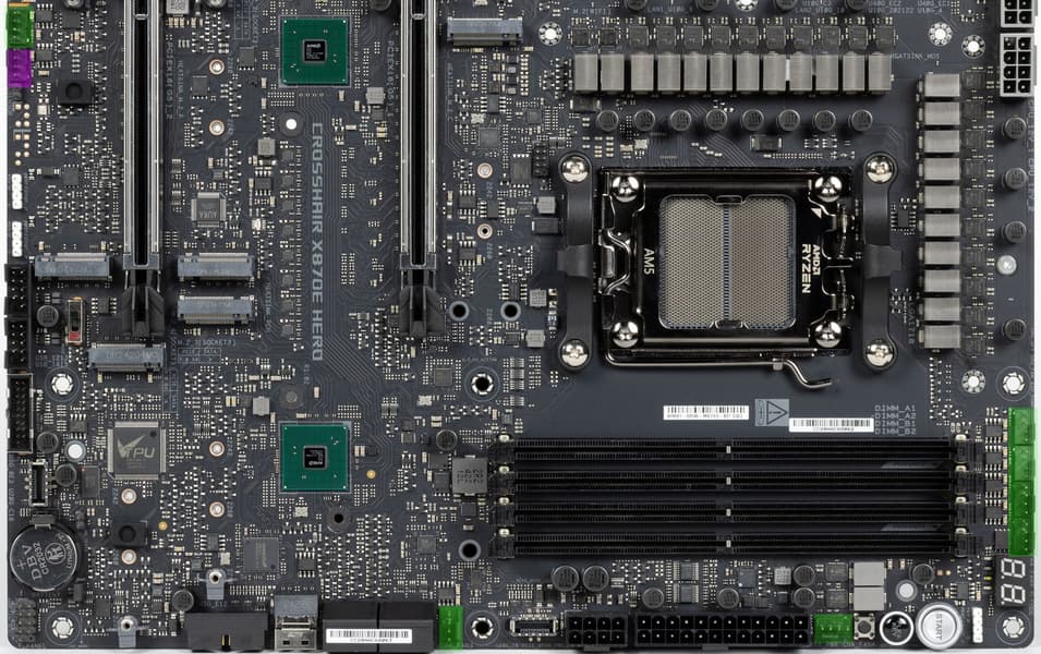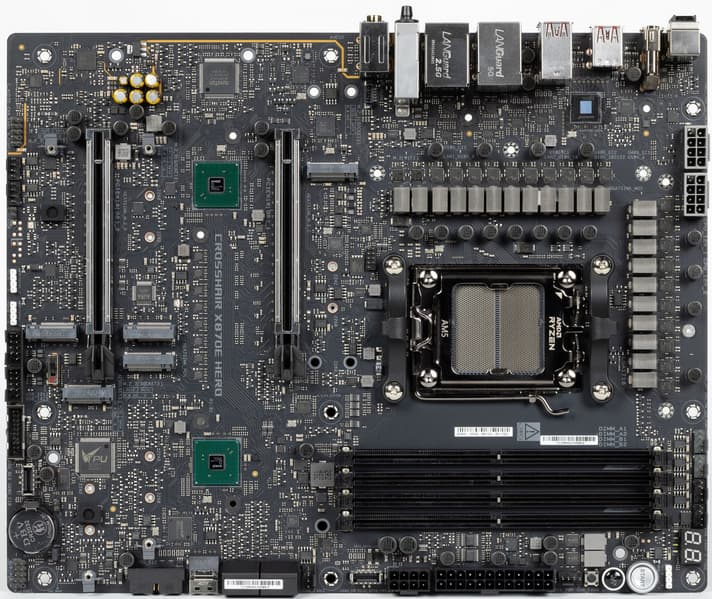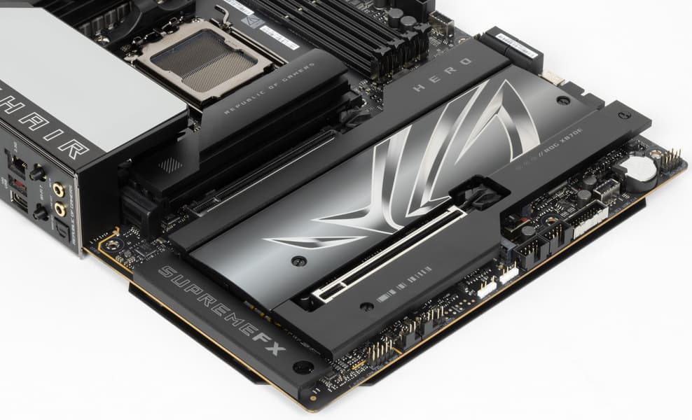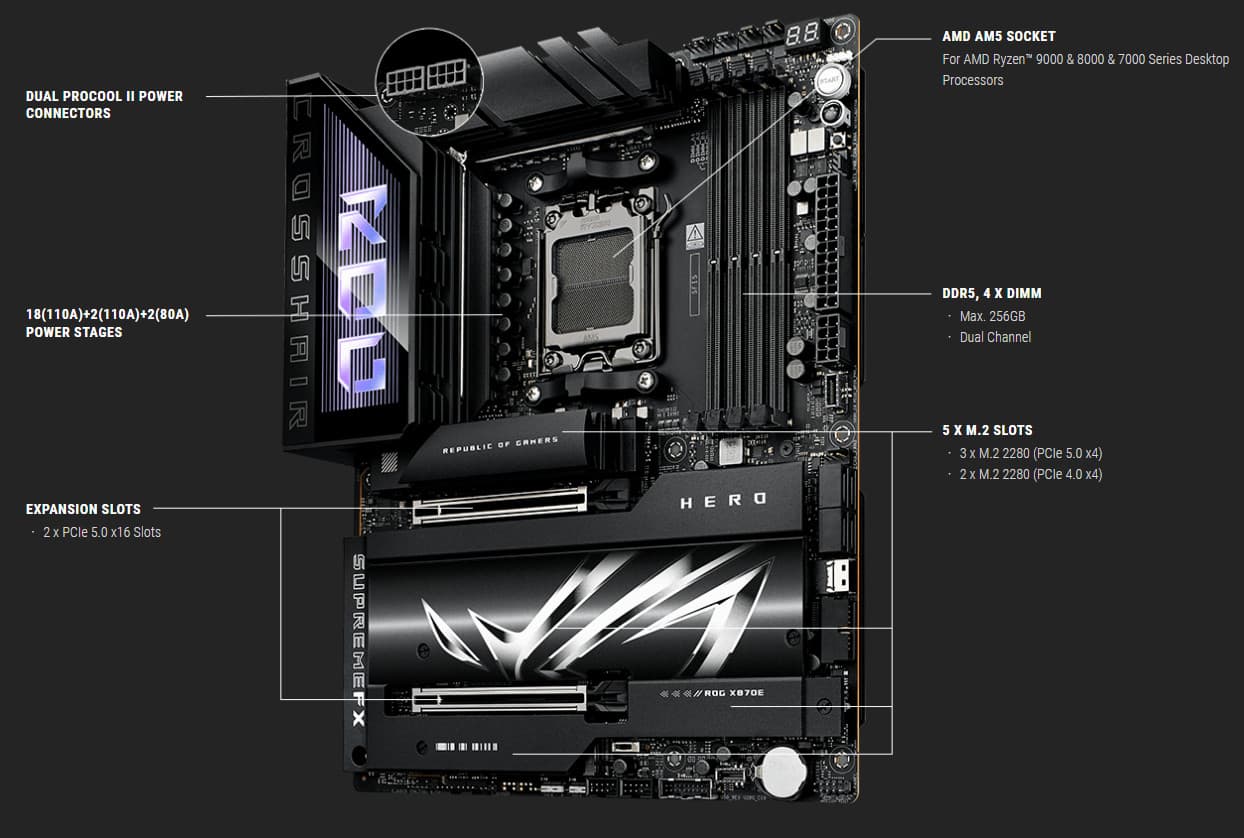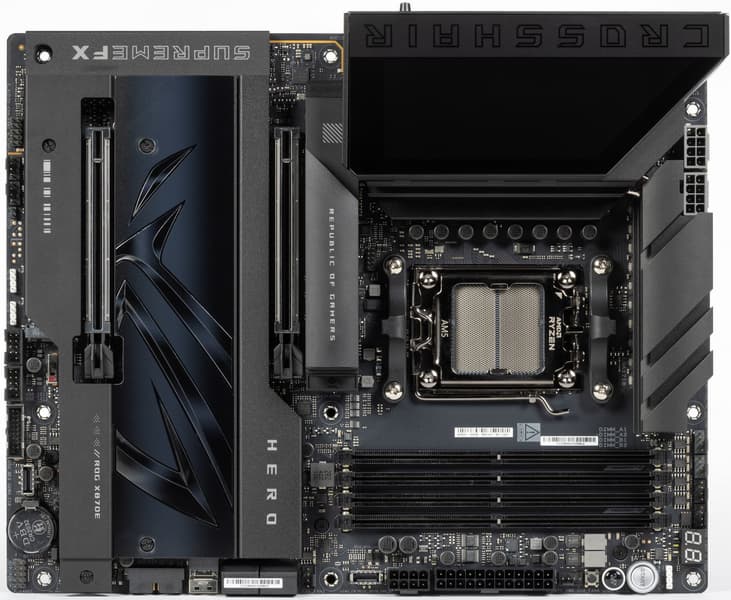 Вернемся к насущным делам: очередной материнской платой на чипсете X870E и с процессорным сокетом AM5, попавшей к нам в лабораторию, стал продукт компании Asus, а именно Asus ROG Crosshair X870E Hero. Эта матплата относится к топовому суббренду ROG, причем входит во флагманскую серию Crosshair, поэтому перед нами почти флагман (мы помним, что самая-самая в этой линейке — материнка c суффиксом Extreme, а Hero — на ступень ниже).