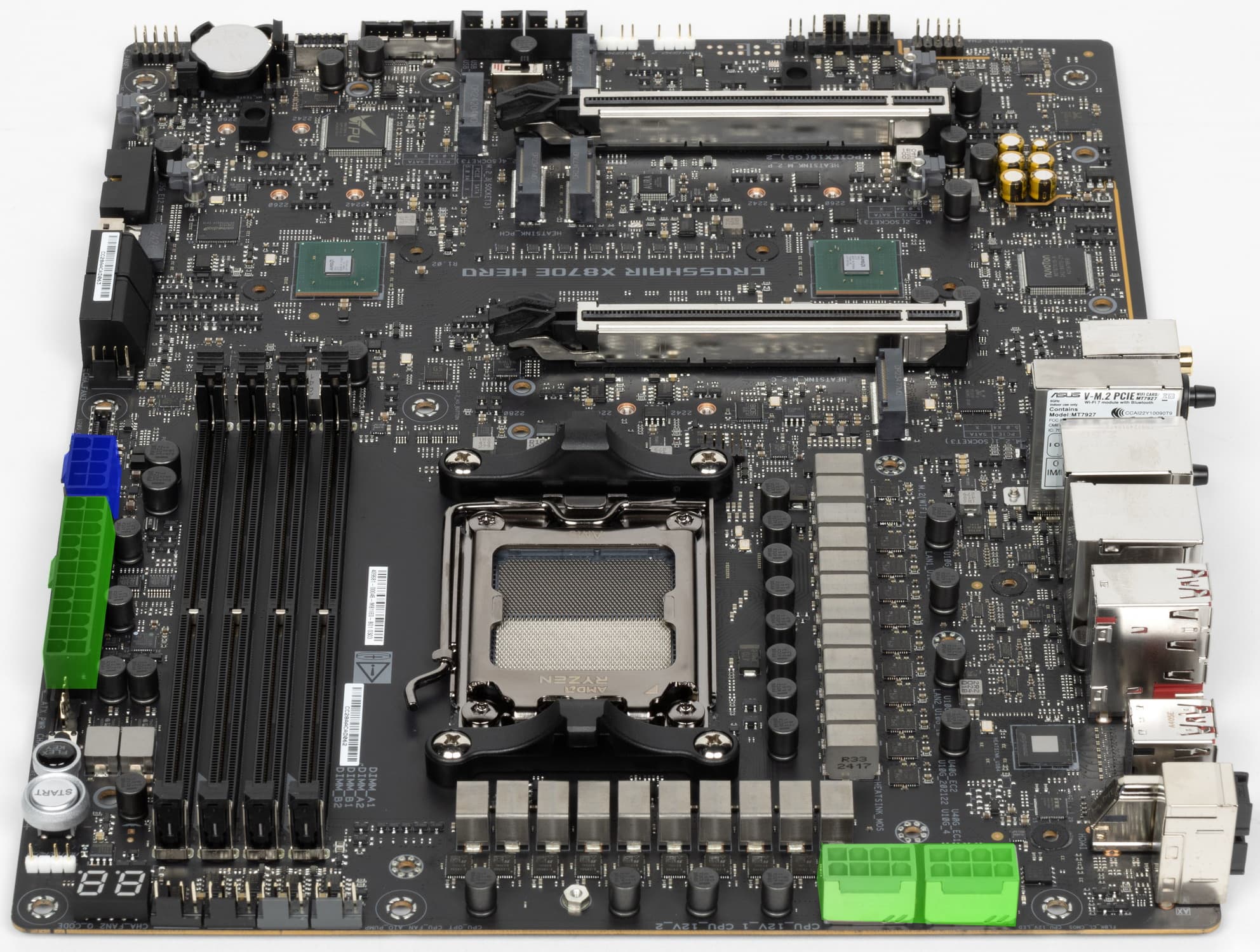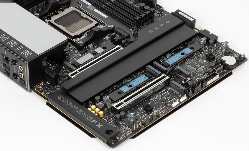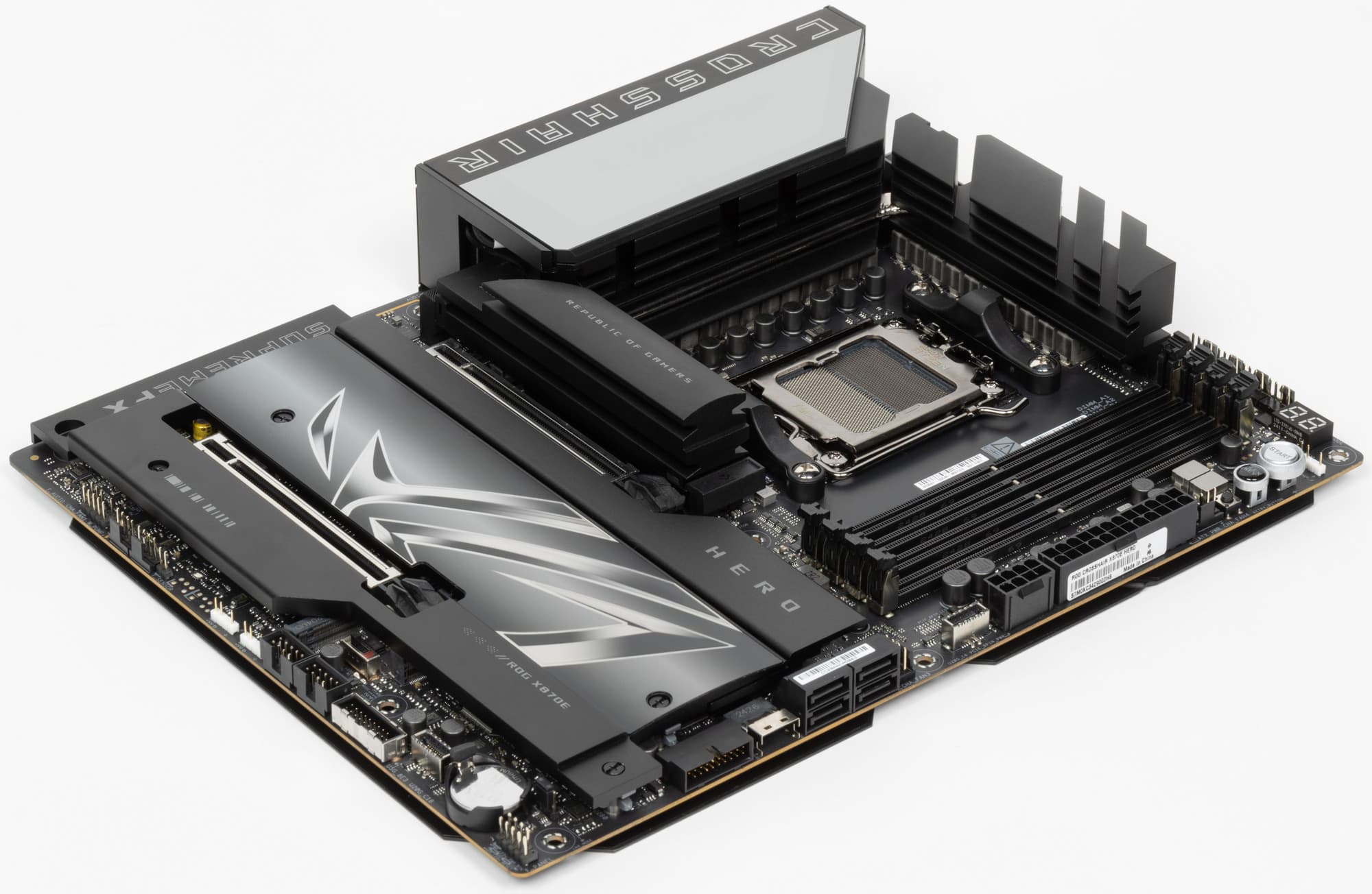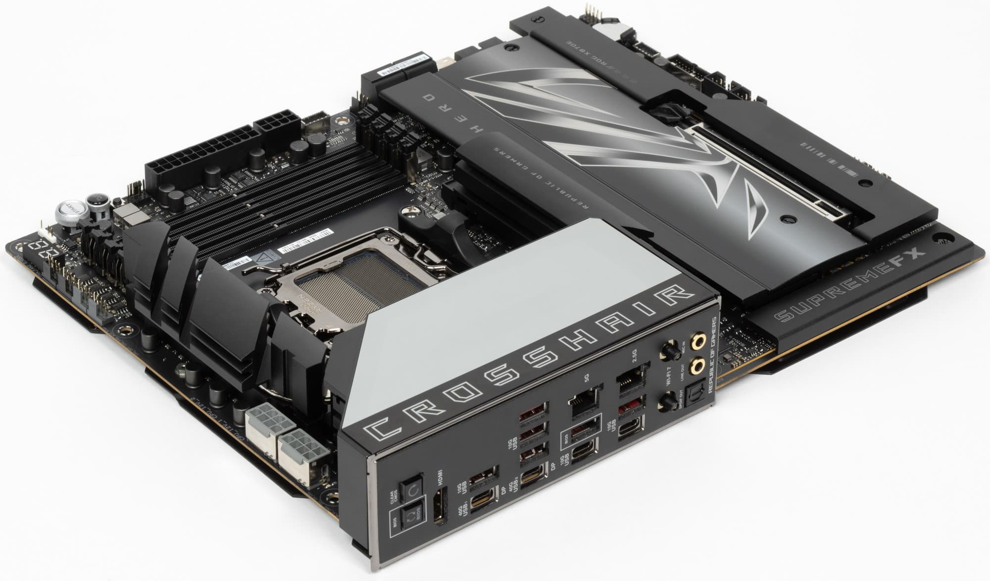 Вернемся к насущным делам: очередной материнской платой на чипсете X870E и с процессорным сокетом AM5, попавшей к нам в лабораторию, стал продукт компании Asus, а именно Asus ROG Crosshair X870E Hero. Эта матплата относится к топовому суббренду ROG, причем входит во флагманскую серию Crosshair, поэтому перед нами почти флагман (мы помним, что самая-самая в этой линейке — материнка c суффиксом Extreme, а Hero — на ступень ниже).