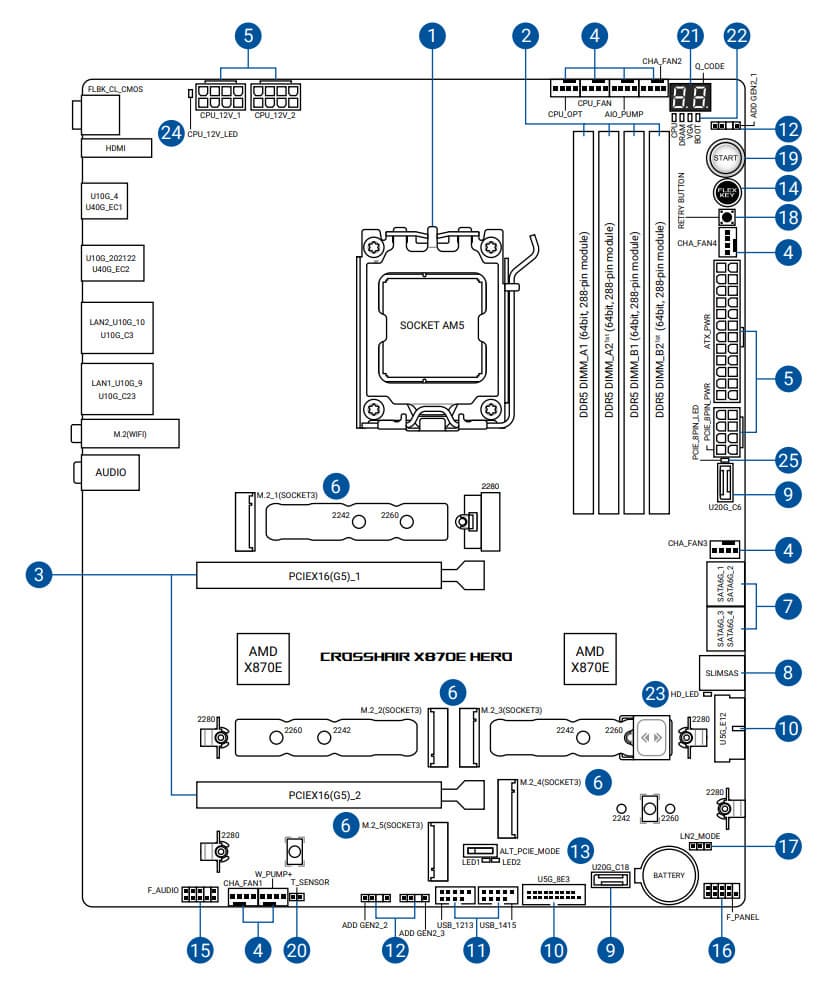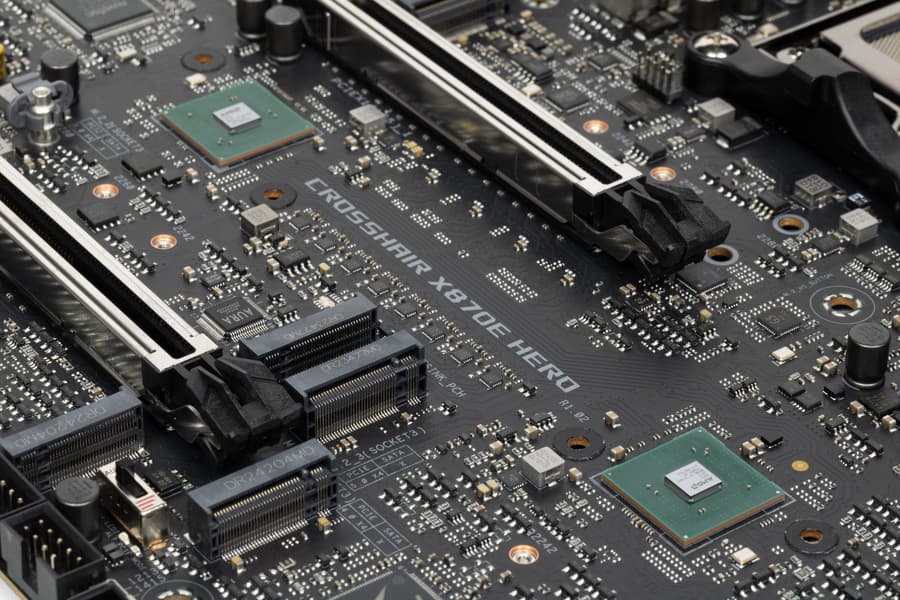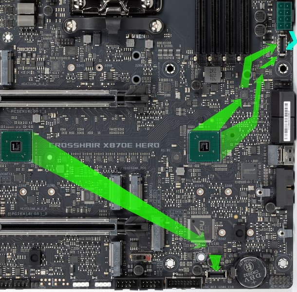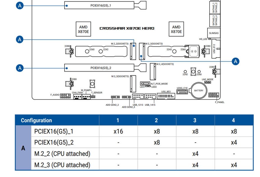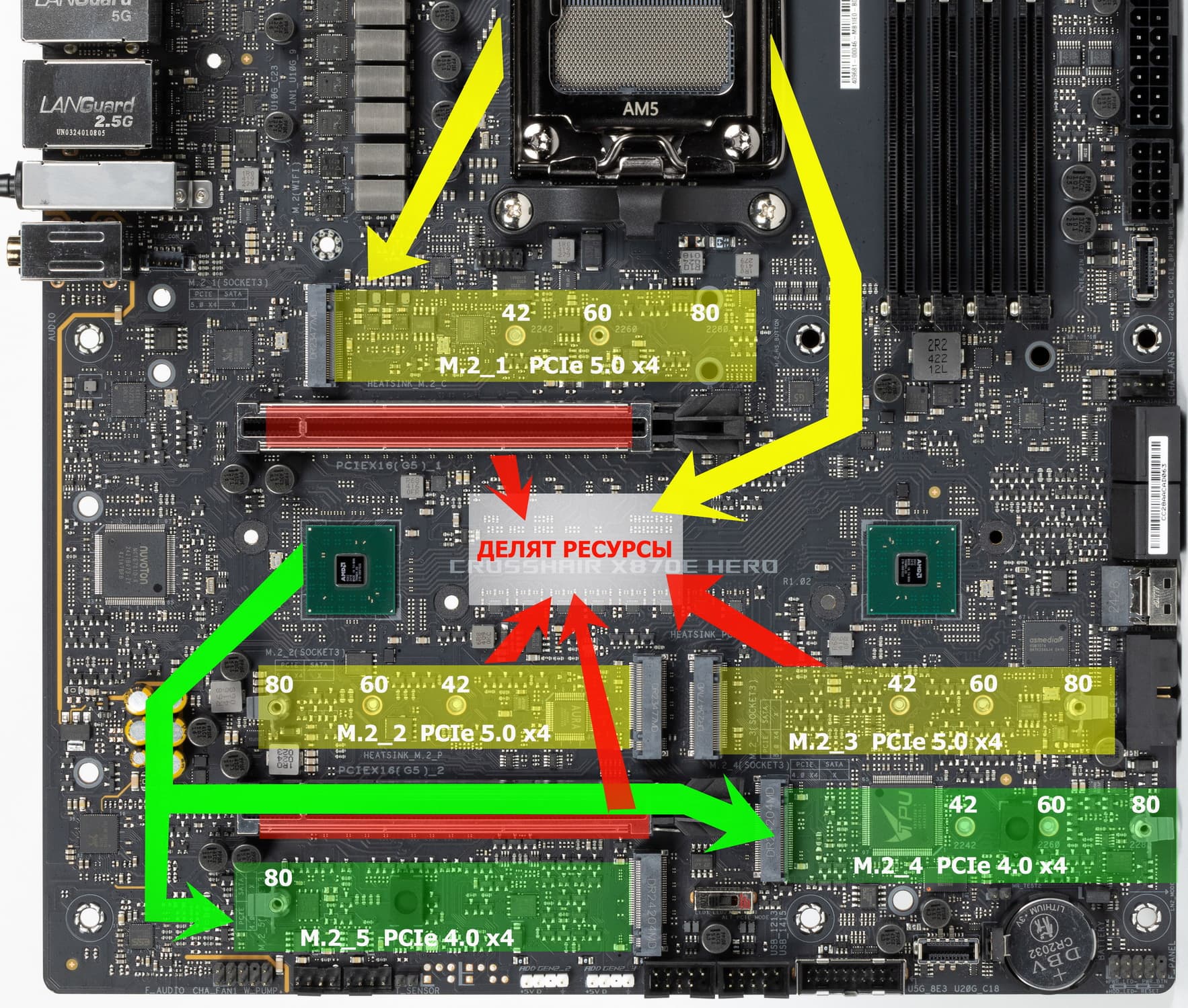 Четвертый и пятый слоты M.2 (M.2_4, M.2_5) получают данные от чипсета X870E, а первые три — от CPU, при этом M.2_2 и M.2_3 получают PCIe 5.0, деля ресурсы со слотами PCIe x16_1/2 (о чем я уже выше рассказывал), M.2_1 штатно получает от процессора PCIe 5.0.
