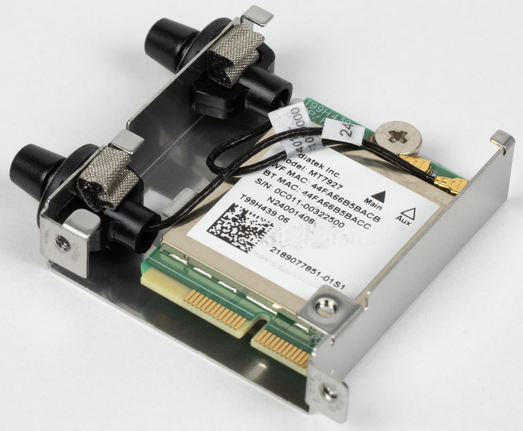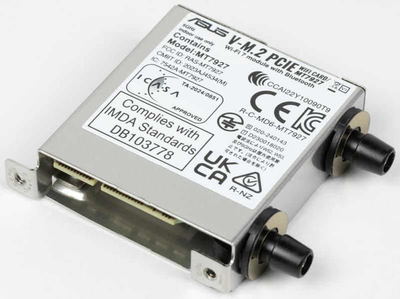 Имеется и комплексный беспроводной адаптер на контроллере MediaTek MT7927, через который реализованы Wi-Fi 7 (802.11a/b/g/n/ac/ax/be, 2,4/5/6 ГГц) и Bluetooth 5.4. Он установлен в слот M.2 (E-key), и его разъемы для выносных антенн выведены на заднюю панель.