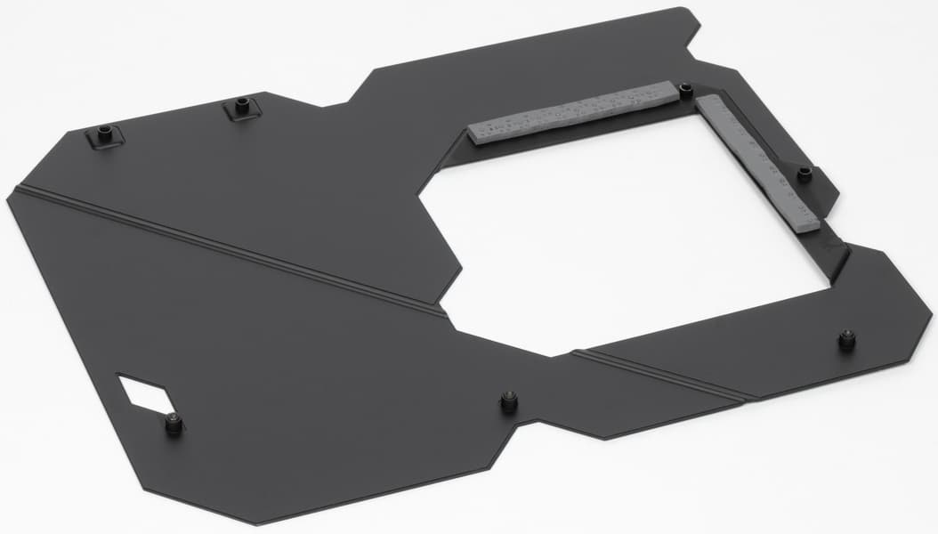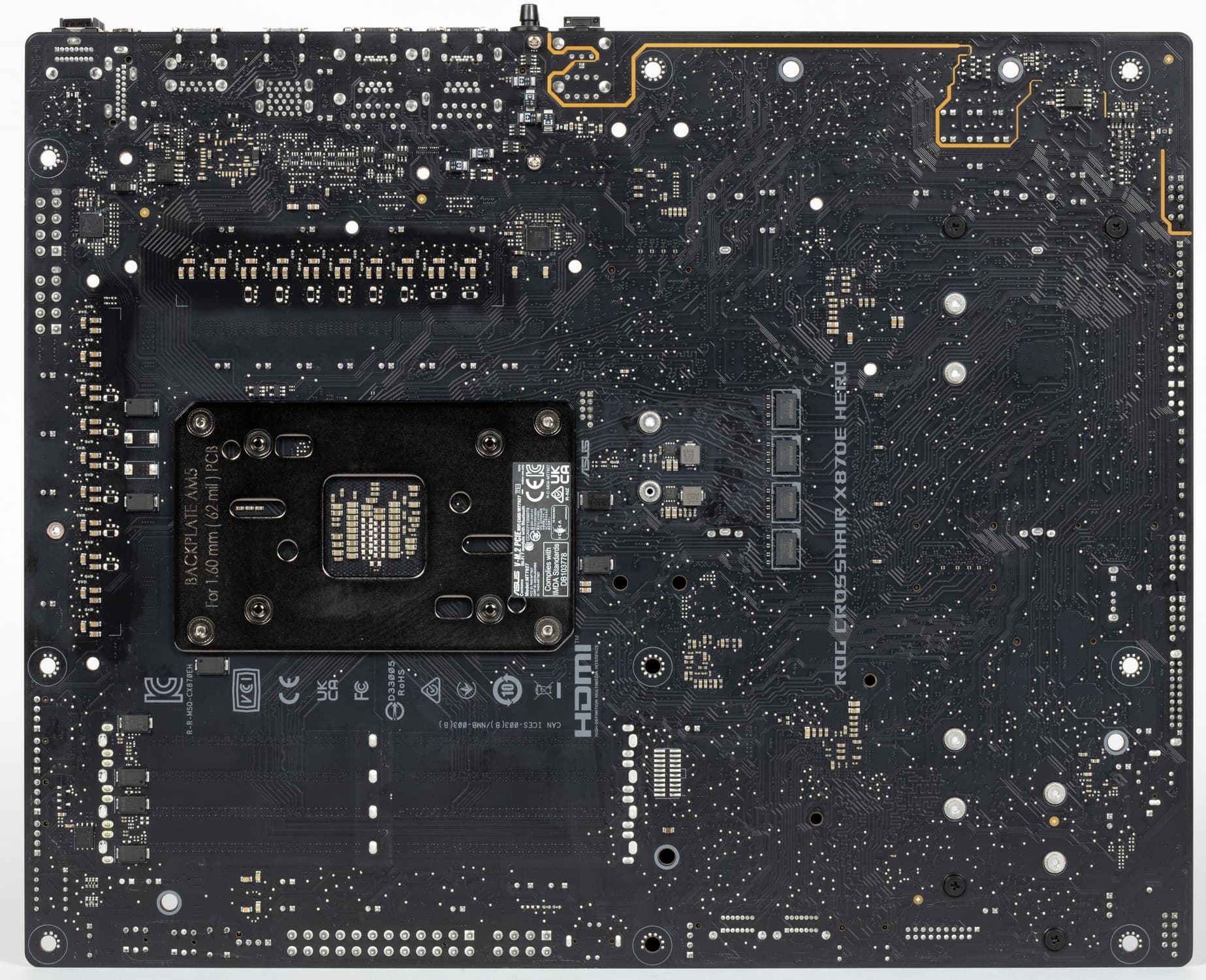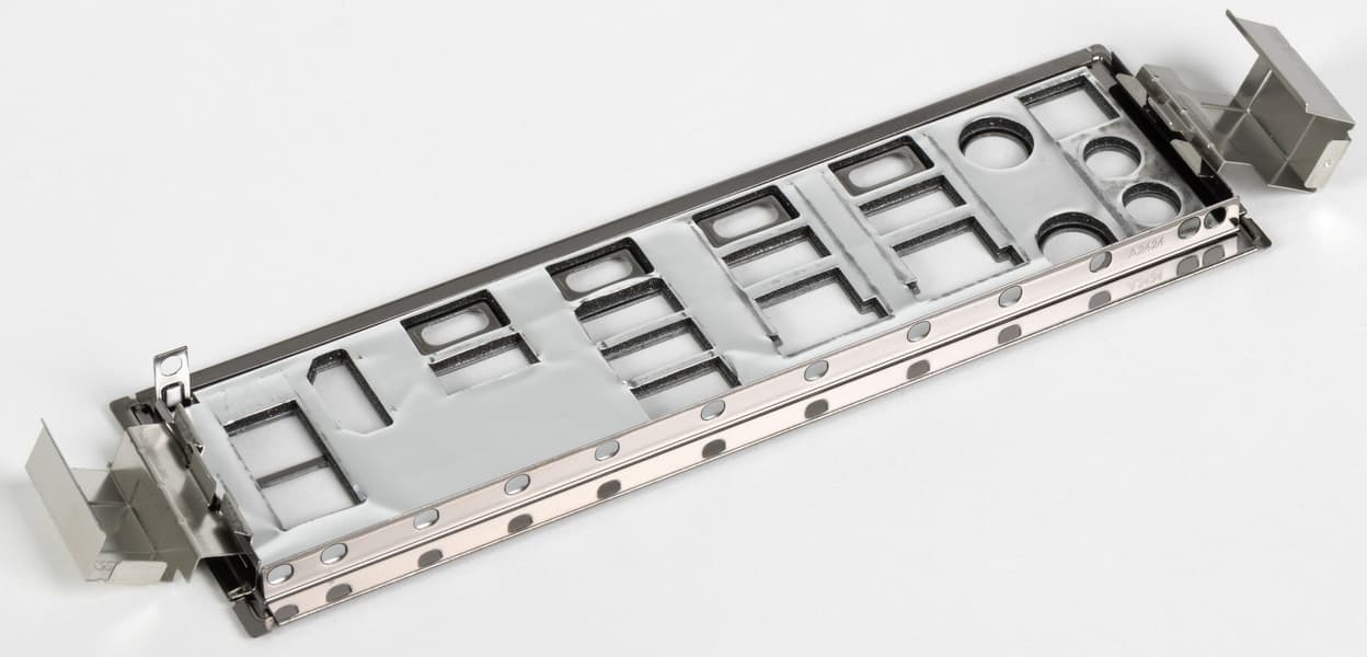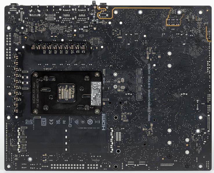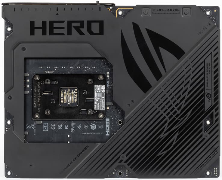 Напомню, что материнская плата имеет бэкплейт, который кроме защитной функции еще и играет роль вспомогательного охладителя матплаты с обратной стороны в области VRM.