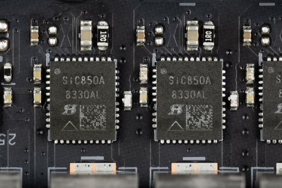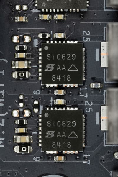 Каждый канал фазы VCore и SoC имеет суперферритовый дроссель и SiC850A DrMOS от Vishay на 110 А.