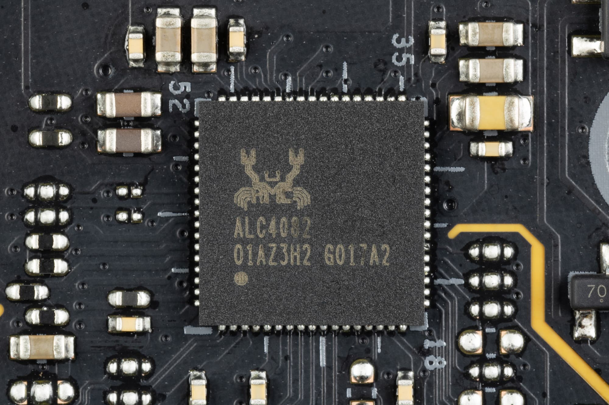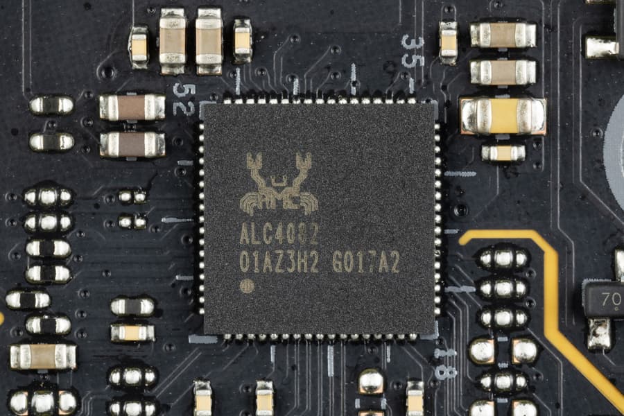 В данном случае плата оснащена аудиоподсистемой, где звуком заведует аудиокодек Realtek ALC4082, он целом обеспечивает вывод звука по схемам до 7.1 с разрешением до 32 бит / 384 кГц. Не забываем, что для работы такого кодека требуются сигнальные линии USB 2.0.