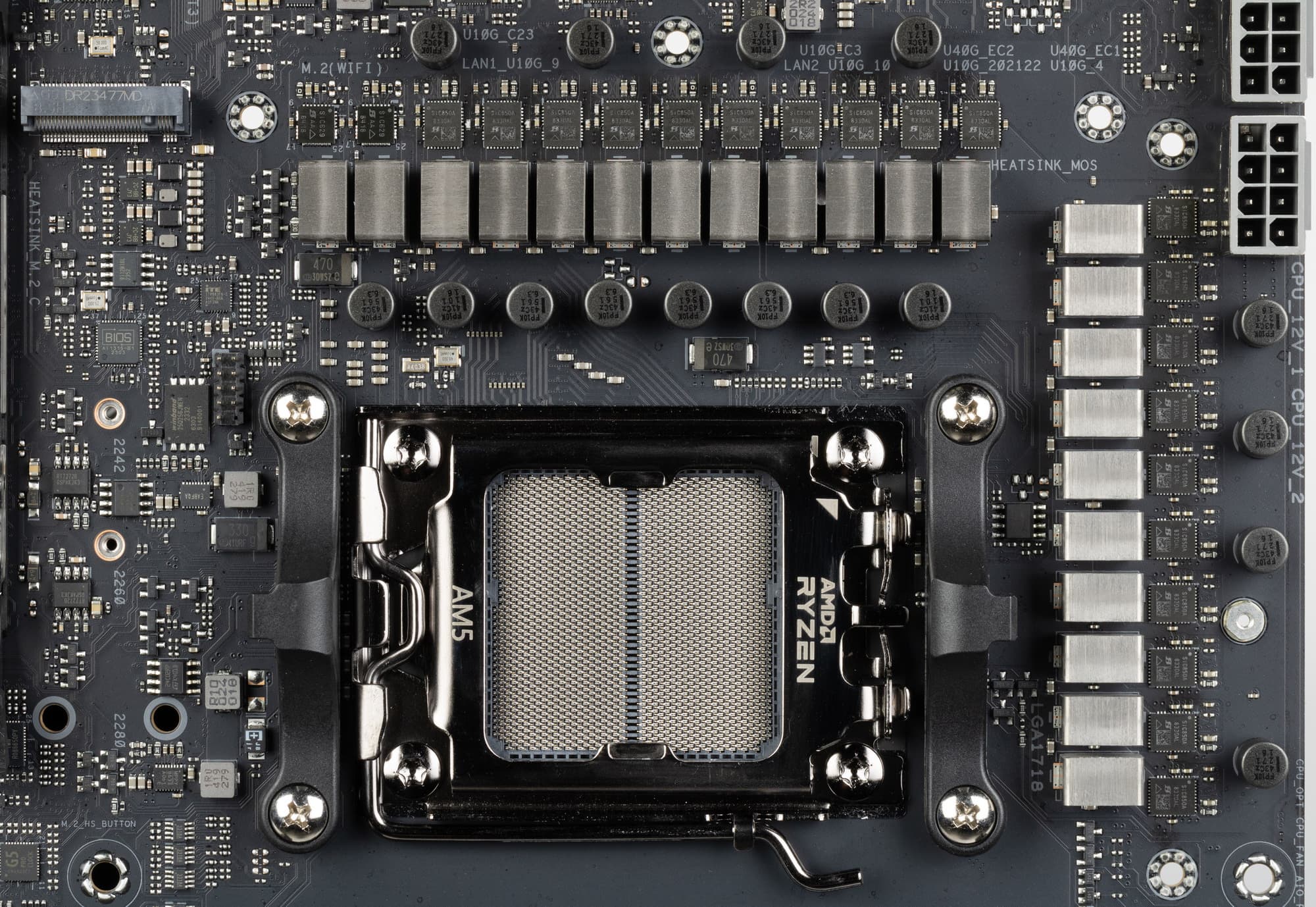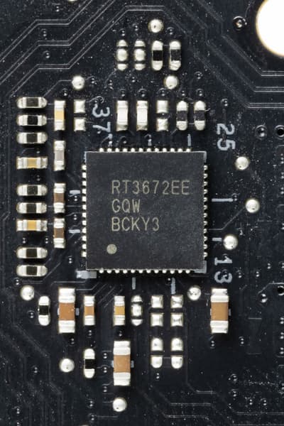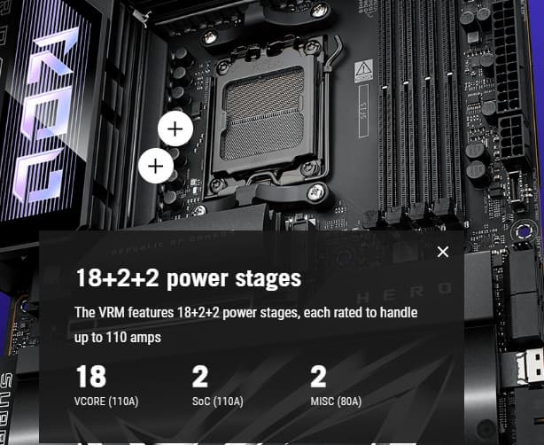 Схема питания процессора выполнена по схеме 18+2+2 (всего 22 фазы: 18 на VCore (ядро процессора), 2 фазы — SoC (I/O-чиплет Ryzen), 2 фазы — VDD_MISC (вывод встроенной графики).