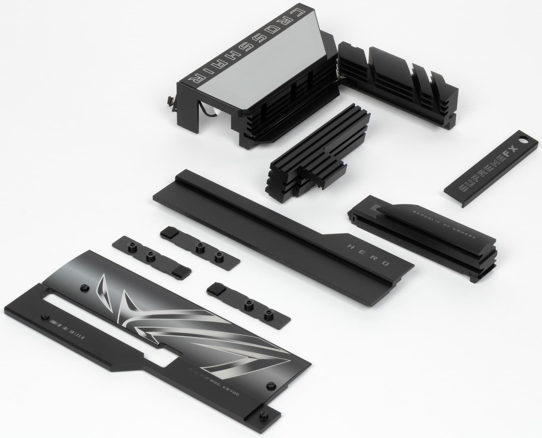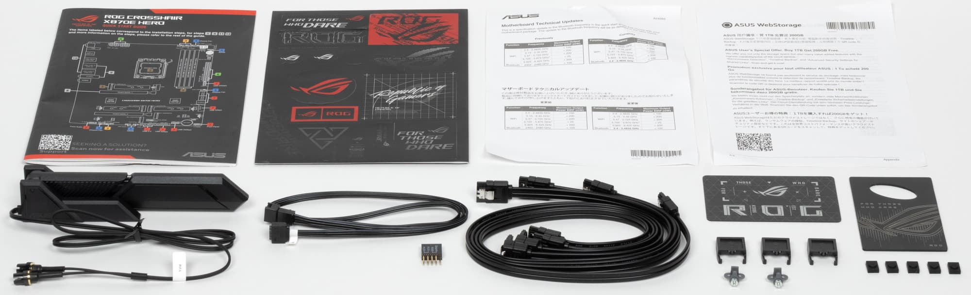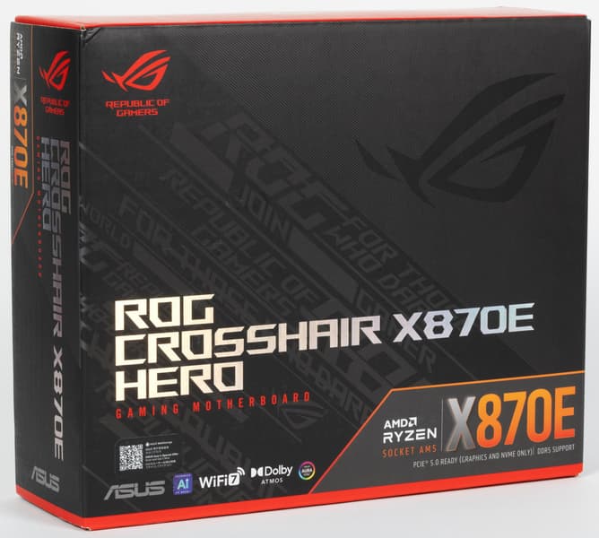 Asus ROG Crosshair X870E Hero поставляется в традиционной коробке фирменного черно-красного дизайна серии ROG. Комплект размещен под платой в отдельных отсеках.