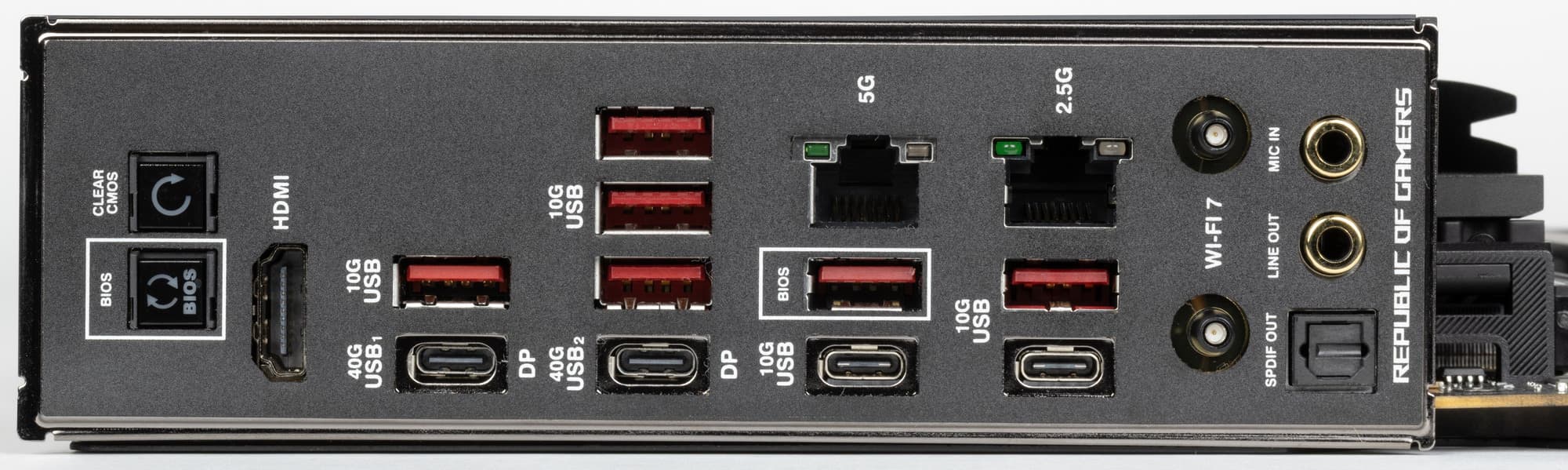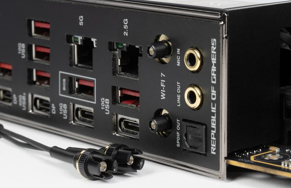 - 8 портов USB 3.2 Gen2: 6 реализованы через X870E, 2 реализованы через CPU, и все представлены на задней панели шестью портами Type-A (красного цвета) и двумя портами Type-C;