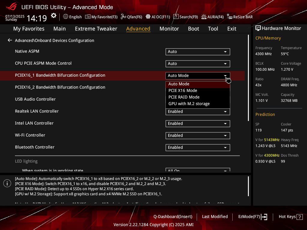 - 16 линий PCIe 5.0 делятся между слотами PCIe x16_1/2, M.2_2 и M.2_3. Варианты: