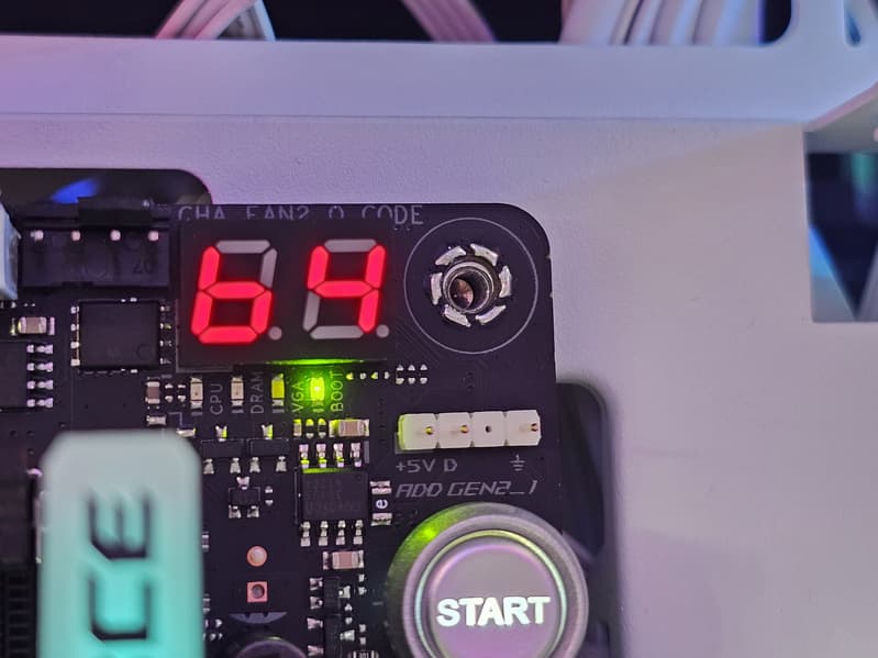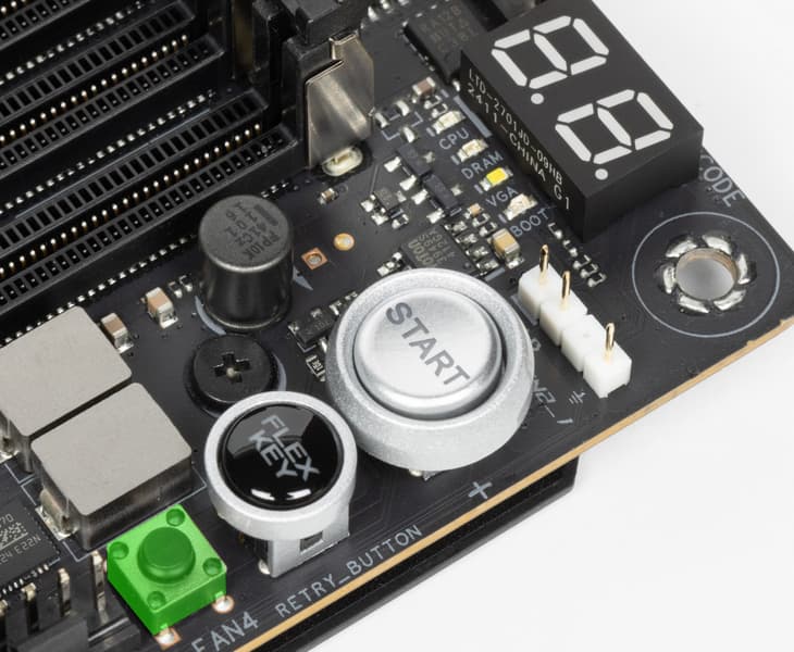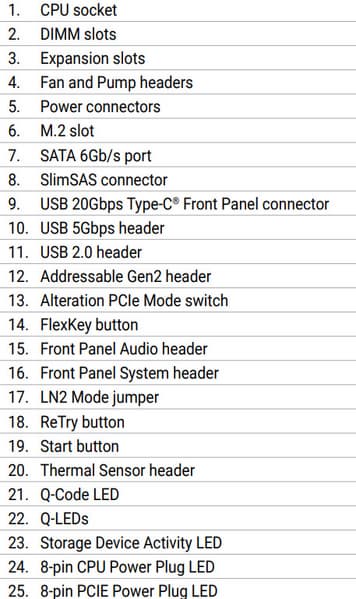 | Прочие внутренние элементы | 24-контактный разъем питания ATX 2 8-контактный разъем питания EPS12V 1 8-контактный разъем питания PCIe 1 слот M.2 (E-key), занят адаптером беспроводных сетей 2 разъема для подключения портов USB 3.2 Gen2x2 Type-C 2 разъема для подключения 4 портов USB 3.2 Gen1 2 разъема для подключения 4 портов USB 2.0 8 разъемов для подключения 4-контактных вентиляторов и помп ЖСО 3 разъема для подключения адресуемой ARGB-ленты 1 разъем аудио для передней панели корпуса 1 переключатель версии PCIe Alt_PCI_mode 1 разъем для термодатчика 1 переключатель LN2 для режима экстремального охлаждения 1 кнопка Retry для повтора запуска системы при оверклокинге 1 разъем для подключения управления с передней панели корпуса 1 кнопка включения питания Power 1 конфигурируемая кнопка перезагрузки FlexKey |