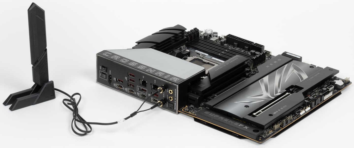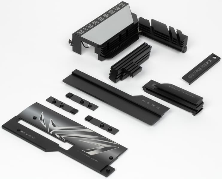Надо отметить, что комплект поставки неплох: кроме традиционных элементов типа руководства пользователя и кабелей SATA, имеются антенна встроенного Wi-Fi-модуля, фирменный адаптер для передней панели, бонусные стикеры, запасные держатели накопителей в слотах M.2, адаптер для подключения внешней подсветки, членская карточка клуба ROG, сувенирная открывалка бутылок.