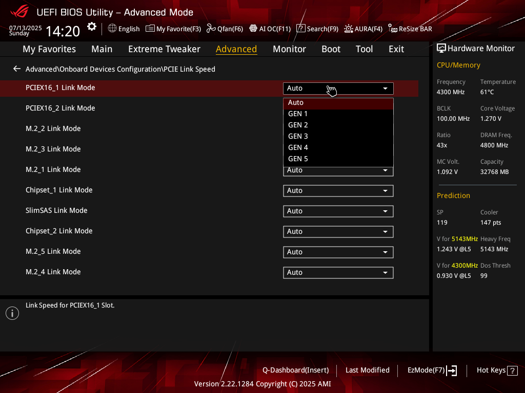 - Слот PCIe x16_1 имеет 8 линий PCIe 5.0, слот PCIe x16_2 отключен, слоты M.2_2 и M.2_3 имеют по 4 линии PCIe 5.0;
