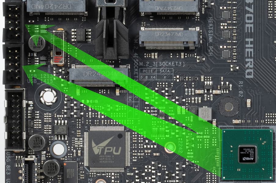 Повторим: чипсет X870E способен реализовать максимально: 8 портов USB 3.2 Gen2/1, 2 USB 3.2 Gen2x2, 12 портов USB 2.0. Процессор Ryzen 7000/9000 способен реализовать до 4 портов USB 3.2 Gen2 и 1 USB 2.0.