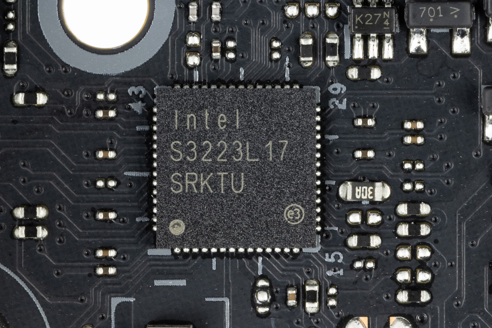 На оборотной стороне расположены традиционные некоторые электронные логические элементы, а также ряд контроллеров. Текстолит обработан неплохо: во всех точках пайки срезаны острые концы. Имеется защитная пластина (бэкплейт).