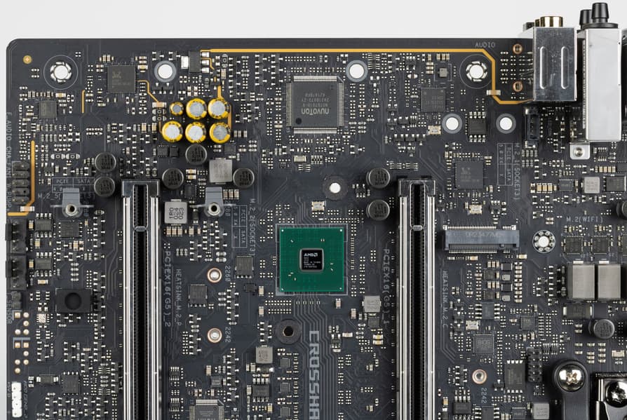 При выводе на рынок новой платформы AM5 AMD внедрила размещение старшего чипсета X670/X670E в виде двух микросхем Promontory 21, которые между собой также соединяются линиями PCIe 4.0, при этом каждый их этих чипов представлял собой фактически более младшие решения B650/B650E. Если как-то грубо отбросить трату 4х линии PCIe на связь между данными микросхемами, то можно сказать, что X6xx имеет ровно в 2 раза больше линий и портов, чем B6xx, то есть разница между X670/X670E и B650/650E – очень существенная именно по количеству имеющихся линий PCIe/USB. Суффикс «E» у тех чипсетов означает лишь поддержку PCIe 5.0 от процессора для слота PCIe x16 и слотов M.2 (а также возможность деления 16-ти линий на варианты x8+x8 или x8+x4+x4), когда как у аналогов без «Е» на «процессорных» слотах версия 4.0 (и 16 линий PCIe делить нельзя – только 1 вариант: все 16 линий на слот для видеокарт). То есть и X870E размещен в тех же микросхемах Promontory 21.