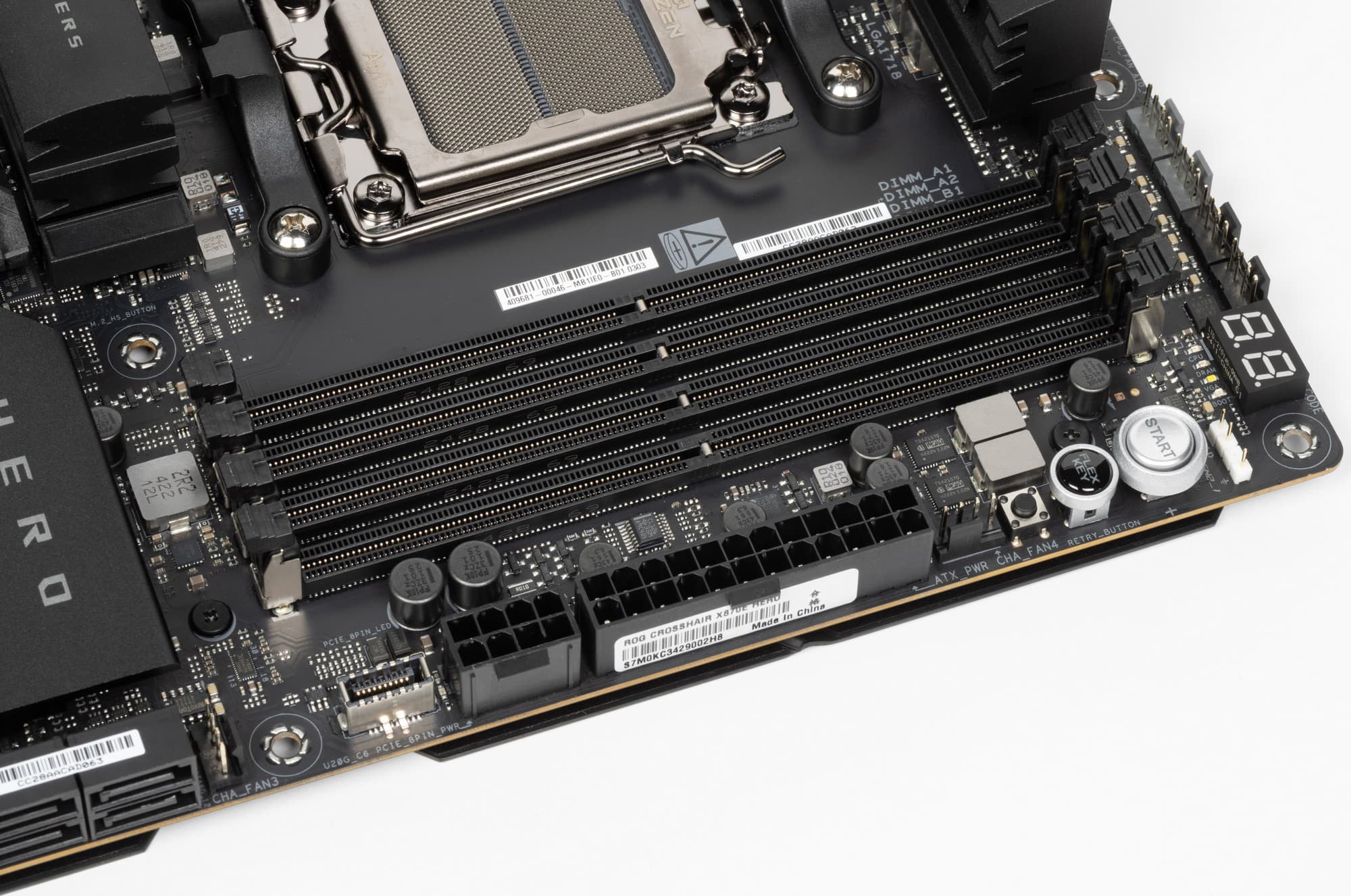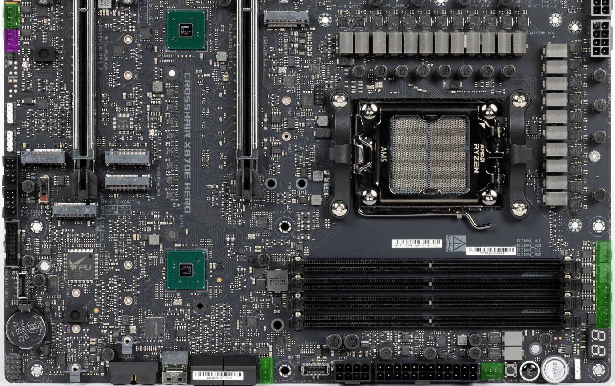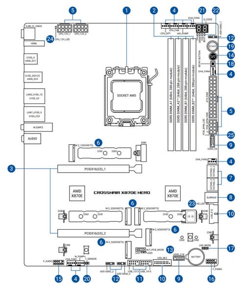 Форм-фактор ATX имеет размеры до 305×244 мм, а E-ATX — до 305×330 мм. Материнская плата Asus ROG Crosshair X870E Hero имеет размеры 305×244 мм, поэтому выполнена в форм-факторе ATX, и на ней имеются 9 монтажных отверстий для установки в корпус.