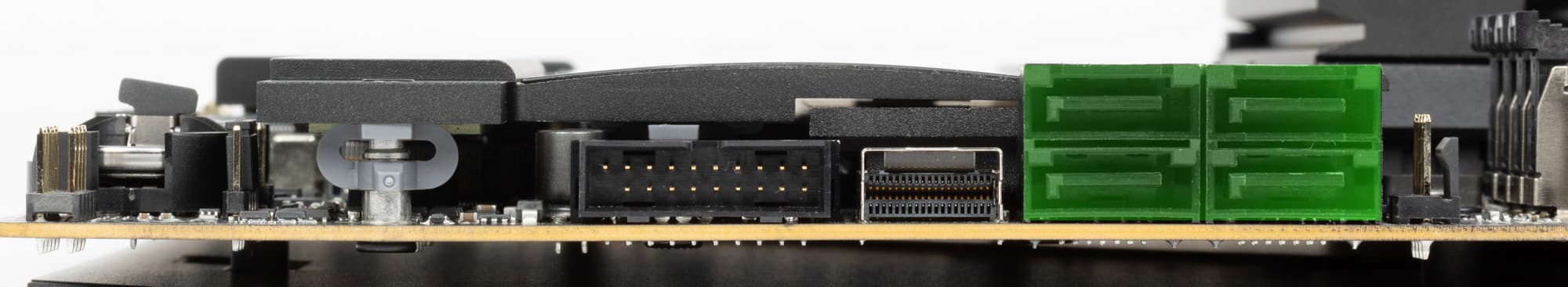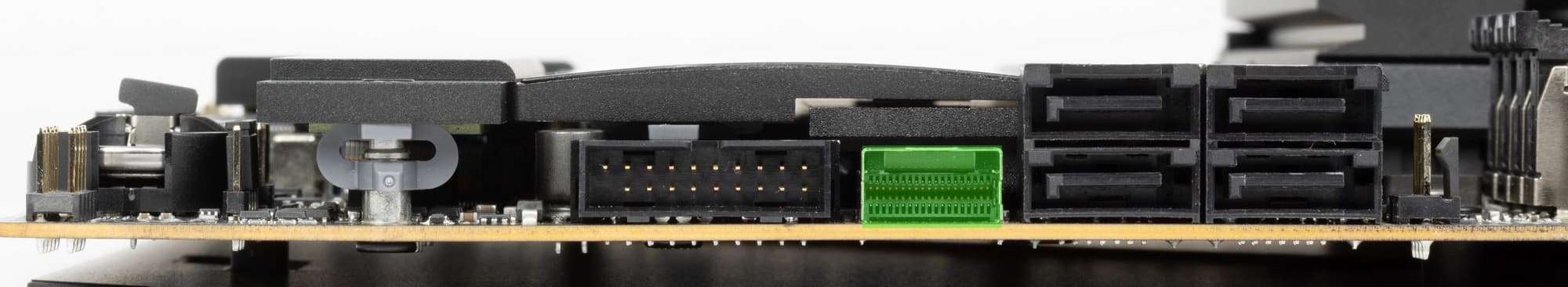 Рядом с ними имеется и относительно новый и редко встречающийся порт SlimSAS – это сверхскоростное соединение, обычно применяемое в серверах и устройствах хранения данных. SAS – последовательный единый интерфейс (Serial Attached SCSI) для подключения разных устройств хранения данных. SlimSAS – это мини-версия данного порта. В данном случае SlimSAS поддерживает подключение еще одного NVMe накопителя PCIe 4.0 x4, либо 4х портов SATA. Интерфейсные кабели для таких целей приобретаются отдельно.