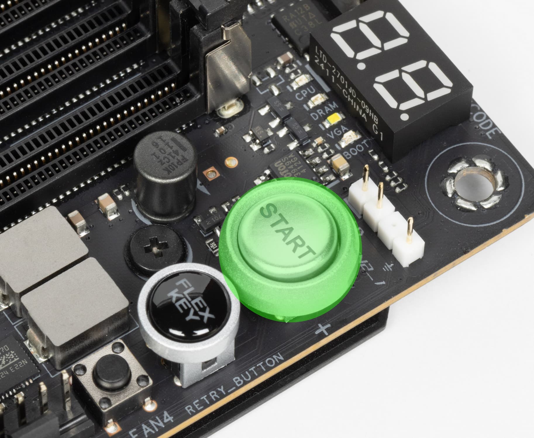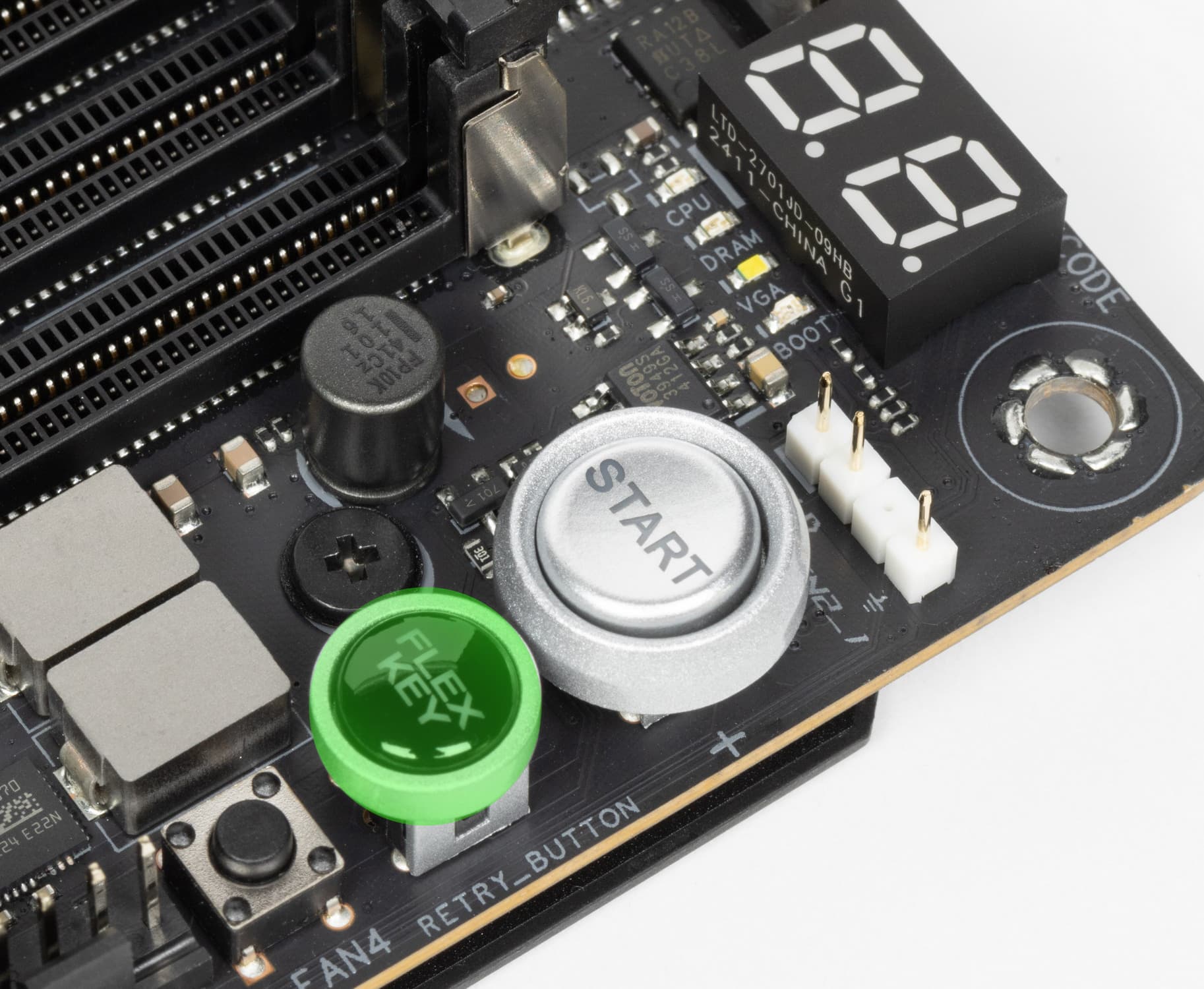Для удобного извлечения видеокарт из слота PCIe x16_1 имеется особый механизм Q-Release Slim: надо потянуть видеокарту в районе крепежной планки вверх. Тогда сработает замок.