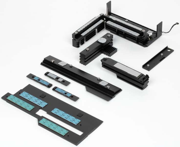 Все M.2 слоты имеют радиаторы. Верхний M.2_1 обладает отдельным мощным радиатором, когда как остальные все слоты M.2 имеют общий радиатор. Слоты M.2, получающие данные от CPU (M.2_1/2/3) кроме верхних радиаторов еще имеют радиаторы для охлаждения тыльной стороны модулей.