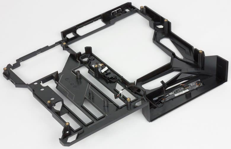 Следующая особенность платы Asus ROG Maximus X Formula — реализация RGB-подсветки. Подсвечиваются декоративные элементы на кожухе панели разъемов. Кроме того, подсвечивается логотип ROG-серии на радиаторе чипсета, полупрозрачные замки на двух слотах PCI Express x16, декоративные полоски на защитном кожухе и кнопки питания и перезагрузки. Настраивается подсветка традиционно с использованием утилиты Asus Aura Sync, которая позволяет выбрать цвет подсветки и различные эффекты.