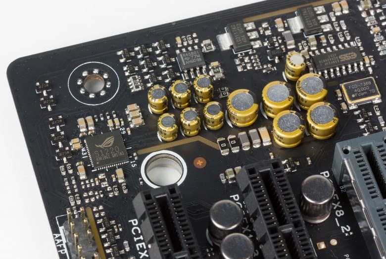Аудиоподсистема платы Asus ROG Maximus X Formula основана на кодеке Realtek ALC1220 и изолирована на уровне слоев PCB от прочих компонентов платы. Визуально элементы аудиотракта выделены в отдельную зону. В фильтрующих цепях аудиотракта применяются японские конденсаторы Nichicon.