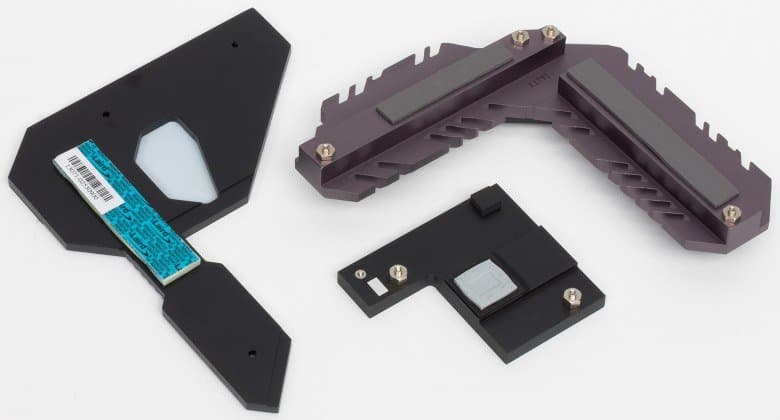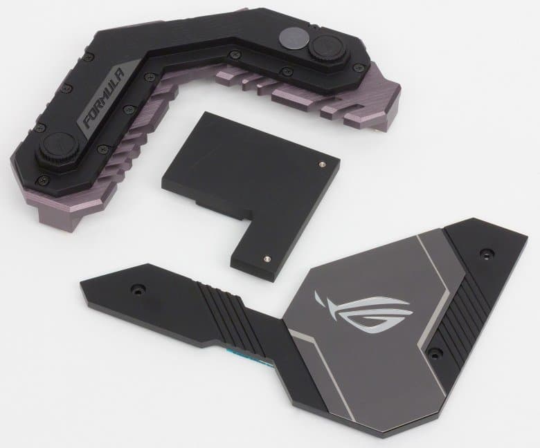 Система охлаждения платы Asus ROG Maximus X Formula состоит из трех радиаторов. Один радиатор углового типа расположен по двум смежным сторонам процессорного разъема и предназначен для отвода тепла от MOSFET-транзисторов регулятора напряжения питания процессора. Еще один радиатор установлен на чипсете. Есть и радиатор, который устанавливается на SSD-накопитель, вставляемый в один из разъемов M.2.