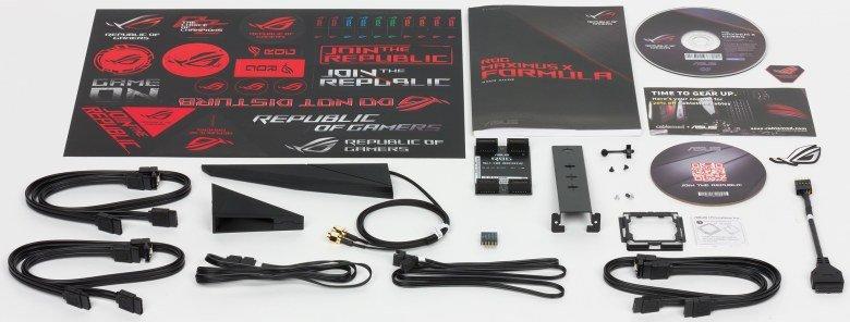 В комплект поставки входит руководство пользователя, DVD-диск с драйверами и утилитами, стикеры для кабелей и набор наклеек Asus ROG, шесть SATA-кабелей (все разъемы с защелками, три кабеля имеют угловой разъем с одной стороны), мостик SLI на две видеокарты, кабель для подключения RGB-ленты, кабель для подключения адресуемой RGB-ленты, антенна для Wi-Fi-модуля, держатель для вертикальной установки на плату M.2-накопителя, пластиковая рамка для безопасной установки процессора в разъем на плате, а также подставка под кружку с пивом с логотипом Asus ROG.