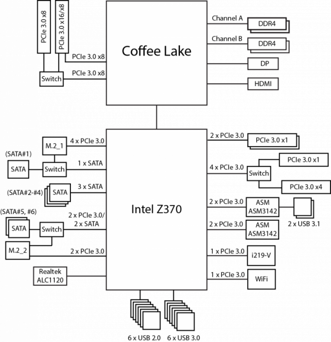 Напомним, что кроме поддержки разных семейств процессоров чипсет Intel Z370 ничем не отличается от чипсета Intel Z270. Intel Z370 имеет 30 высокоскоростных портов ввода/вывода (HSIO), в качестве которых могут выступать порты PCIe 3.0, USB 3.0 и SATA 6 Гбит/с. Часть портов строго фиксирована, но есть HSIO-порты, которые могут конфигурироваться как USB 3.0 или PCIe 3.0, SATA или PCIe 3.0. Всего может быть не более 10 портов USB 3.0, не более 6 портов SATA и не более 24 портов PCIe 3.0.