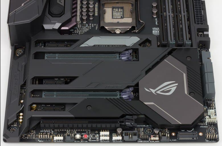 Для установки видеокарт, плат расширения и накопителей на материнской плате Asus ROG Maximus X Formula имеется три слота с форм-фактором PCI Express x16, три слота PCI Express 3.0 x1 и два разъема M.2.