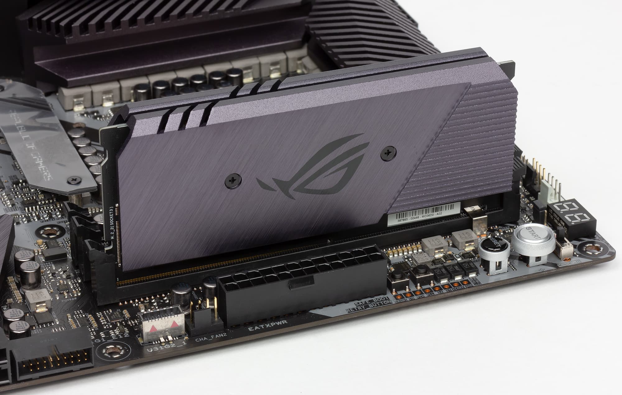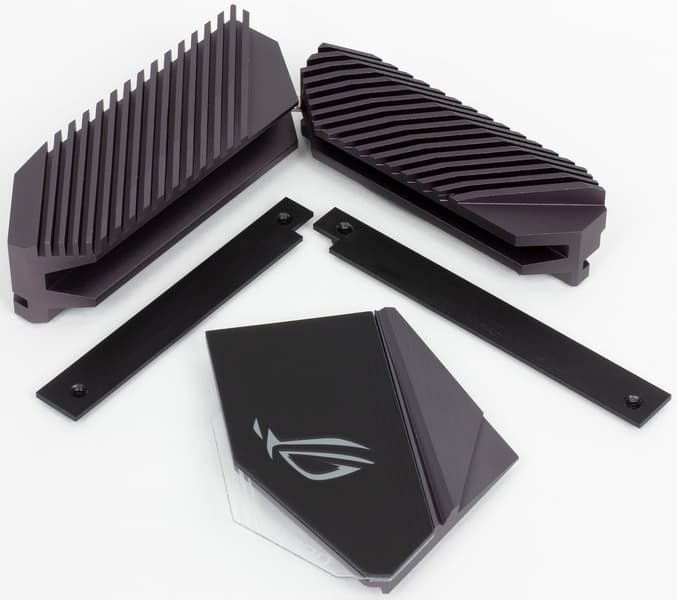 Кроме того, для SSD-накопителей, устанавливаемых в разъемы M.2 на плате ROG DIMM.2, также предусмотрены радиаторы.