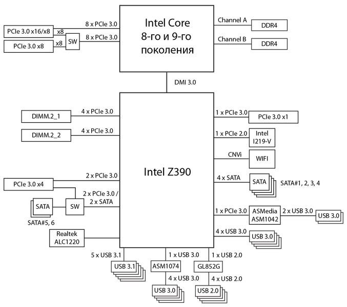 Слот DIMM.2 реализован через чипсет Intel Z390.