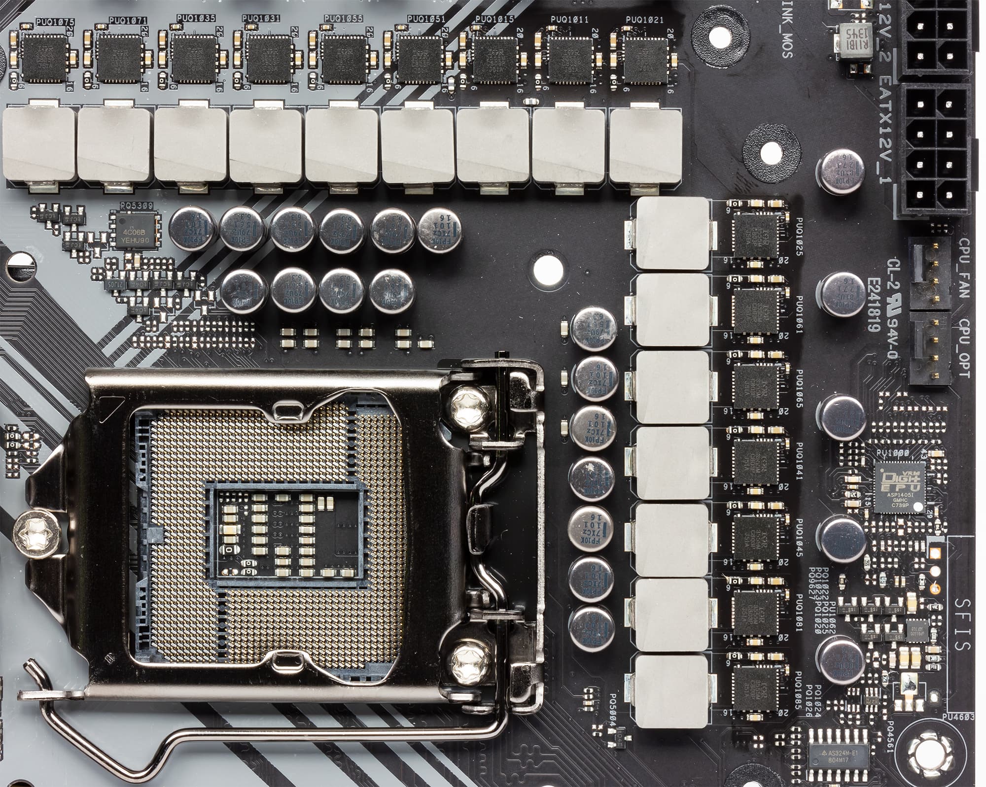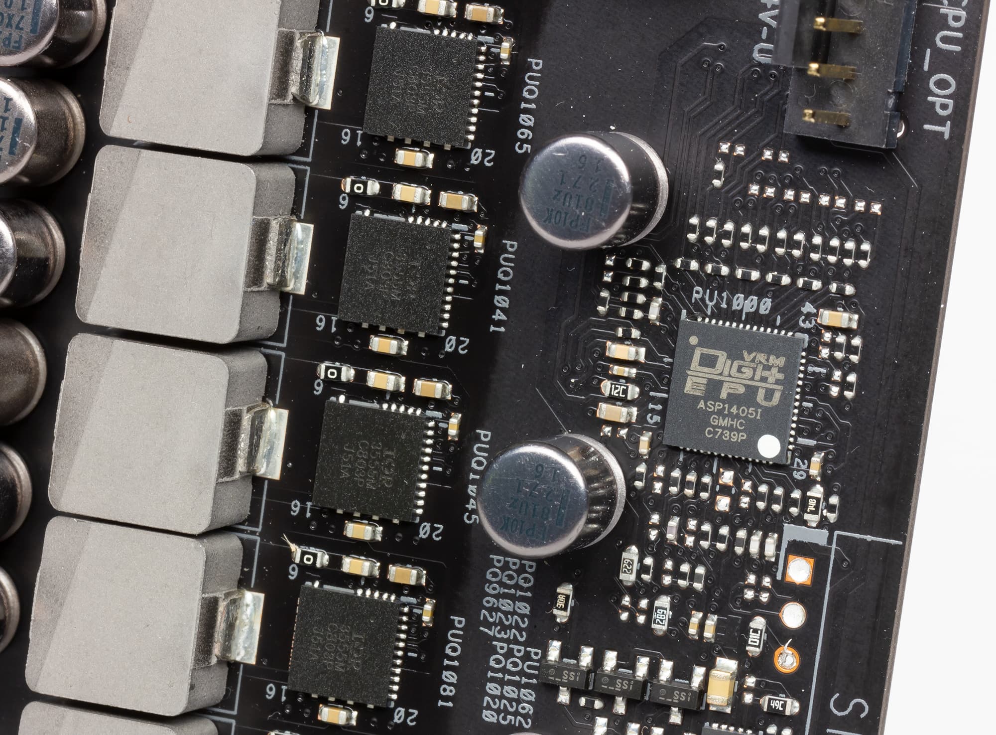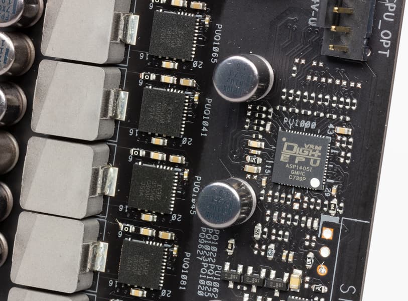 Регулятор напряжения питания процессора на плате является 16-канальным и управляется контроллером с маркировкой ASP1405I. Этот контроллер является 8-фазным, и на каждой фазе реализованы два канала питания. В каждом канале питания используется по одному чипу IR3555 компании International Rectifier, который объединяет в себе два MOSFET-транзистора (High и Low), а также MOSFET-драйвер.
