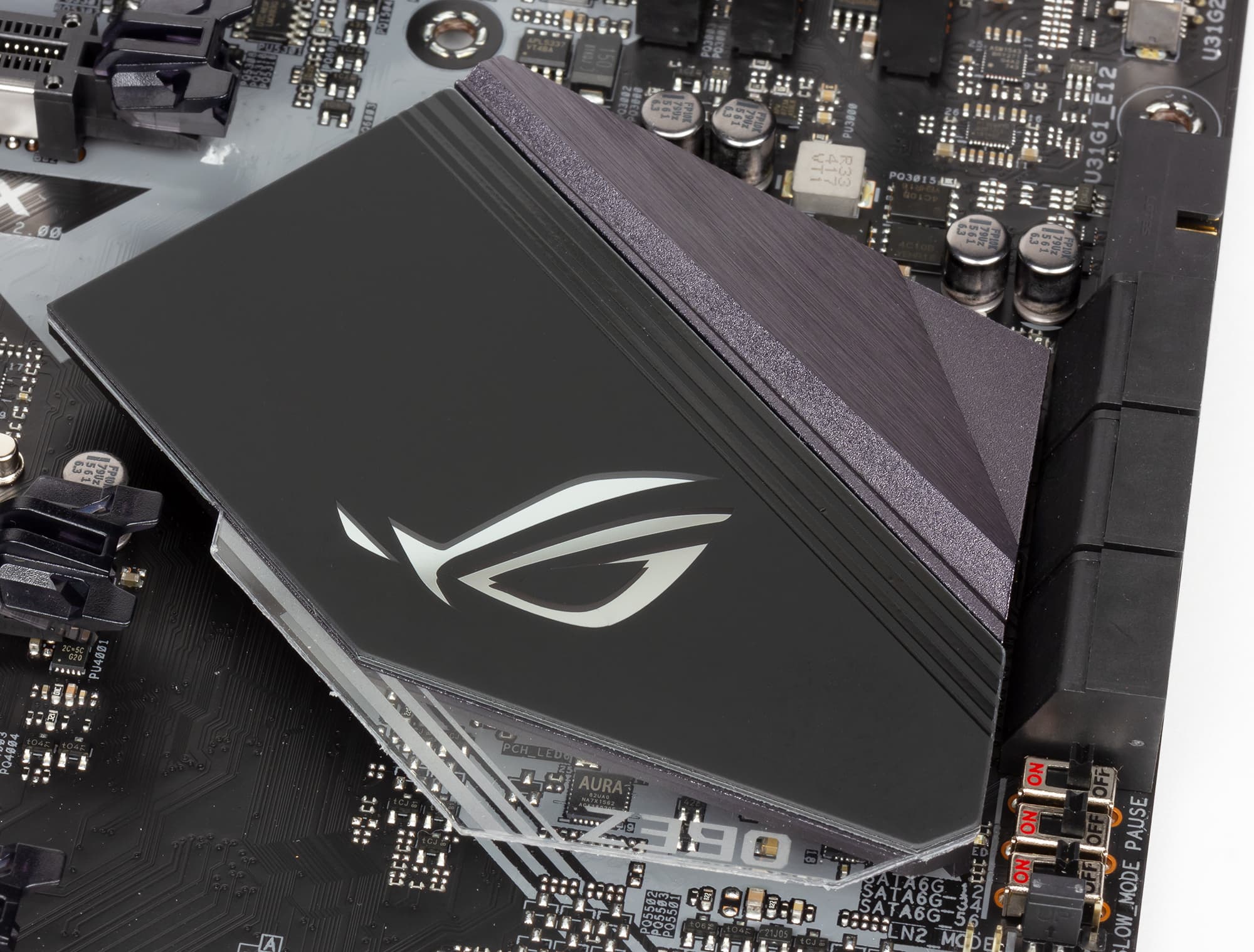 Кроме указанных кнопок на плате Asus ROG Maximus XI Apex есть и ряд переключателей. Как и на всех новых платах Asus, кнопку MemOK! заменил переключатель MemOK! II. Есть на плате и такие переключатели, как Slow_Mode и Pause, которые хорошо знакомы всем, кто занимается экстремальным разгоном с использованием жидкого азота.