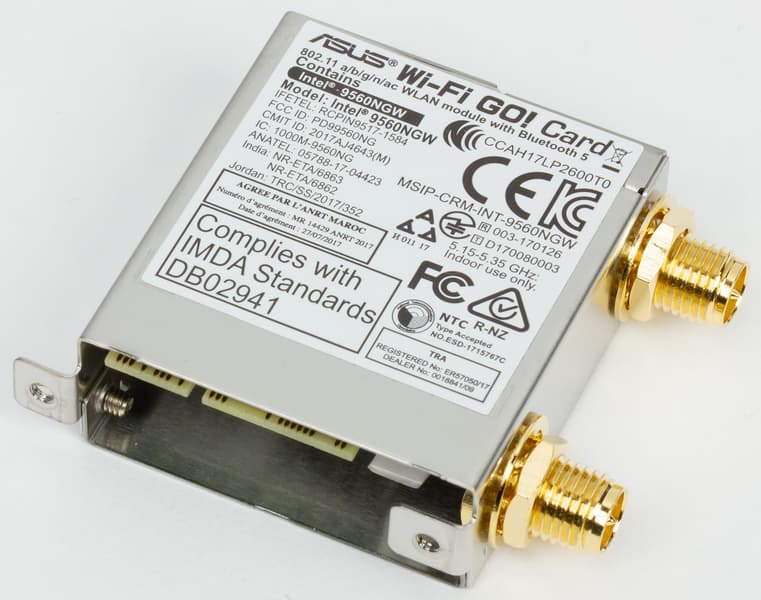 Кроме того, в разъем M.2 на плате установлен Wi-Fi-контроллер Intel Wireless-AC 9560, который использует чипсетный интерфейс CNVi. Напомним, что интерфейс CNVi (Connectivity Integration) обеспечивает работу соединений Wi-Fi (802.11ac, до 1733 Мбит/с) и Bluetooth 5.0. Однако контроллер CNVi — это не полноценный сетевой контроллер, а MAC-контроллер. Для реализации полноценного контроллера нужна еще карта (например, Intel Wireless-AC 9560, как в данном случае) с разъемом M.2 (ключ E-типа), которая поддерживает интерфейс CNVi.