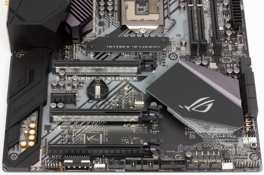 Для установки видеокарт, плат расширения и накопителей на материнской плате Asus ROG Maximus XI Apex имеется три слота с форм-фактором PCI Express x16, один слот PCI Express 3.0 x1 и фирменный слот ROG DIMM.2.