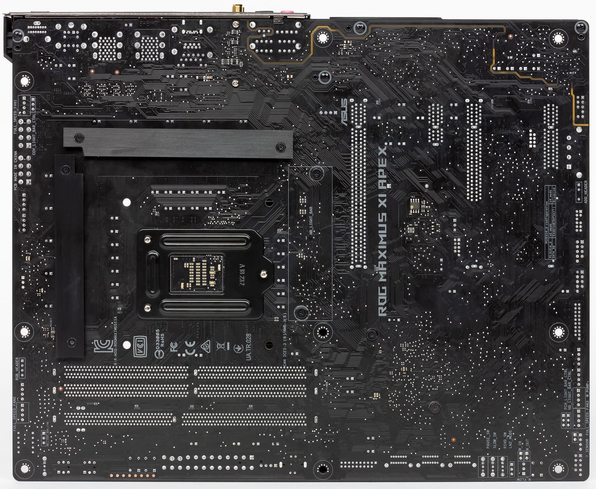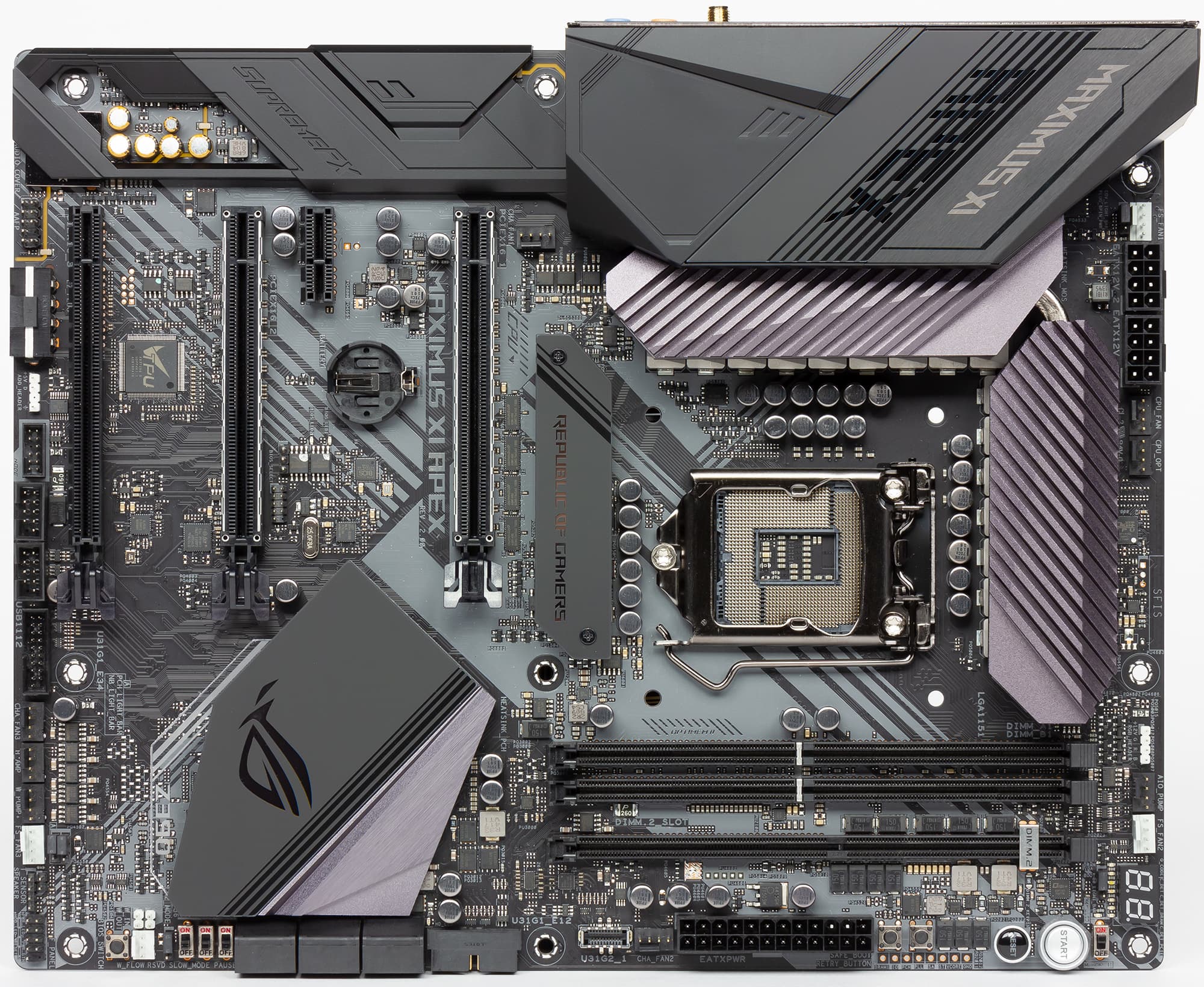 Говоря о дополнительных особенностях платы Asus ROG Maximus XI Apex, стоит отметить, что она совершенно не похожа на предыдущую модель ROG Maximus X Apex на основе чипсета Intel Z370. Предыдущие модели плат серии Apex имели необычную форму за счет вырезов по бокам и форм-фактор E-ATX. У платы Asus ROG Maximus XI Apex и форма обычная, и форм-фактор ATX. Так что в этом смысле все стало обыденно и скучно.