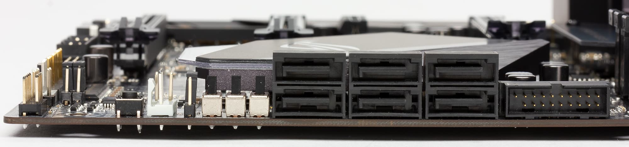 Для подключения еще четырех четырех портов USB 3.0 и четырех портов USB 2.0 на плате имеется две колодки разъемов для портов USB 2.0 (по два порта на колодку) и две колодки портов USB 3.0. Кроме того, на плате есть разъем вертикального типа для подключения фронтального порта USB 3.1 (Type-С).