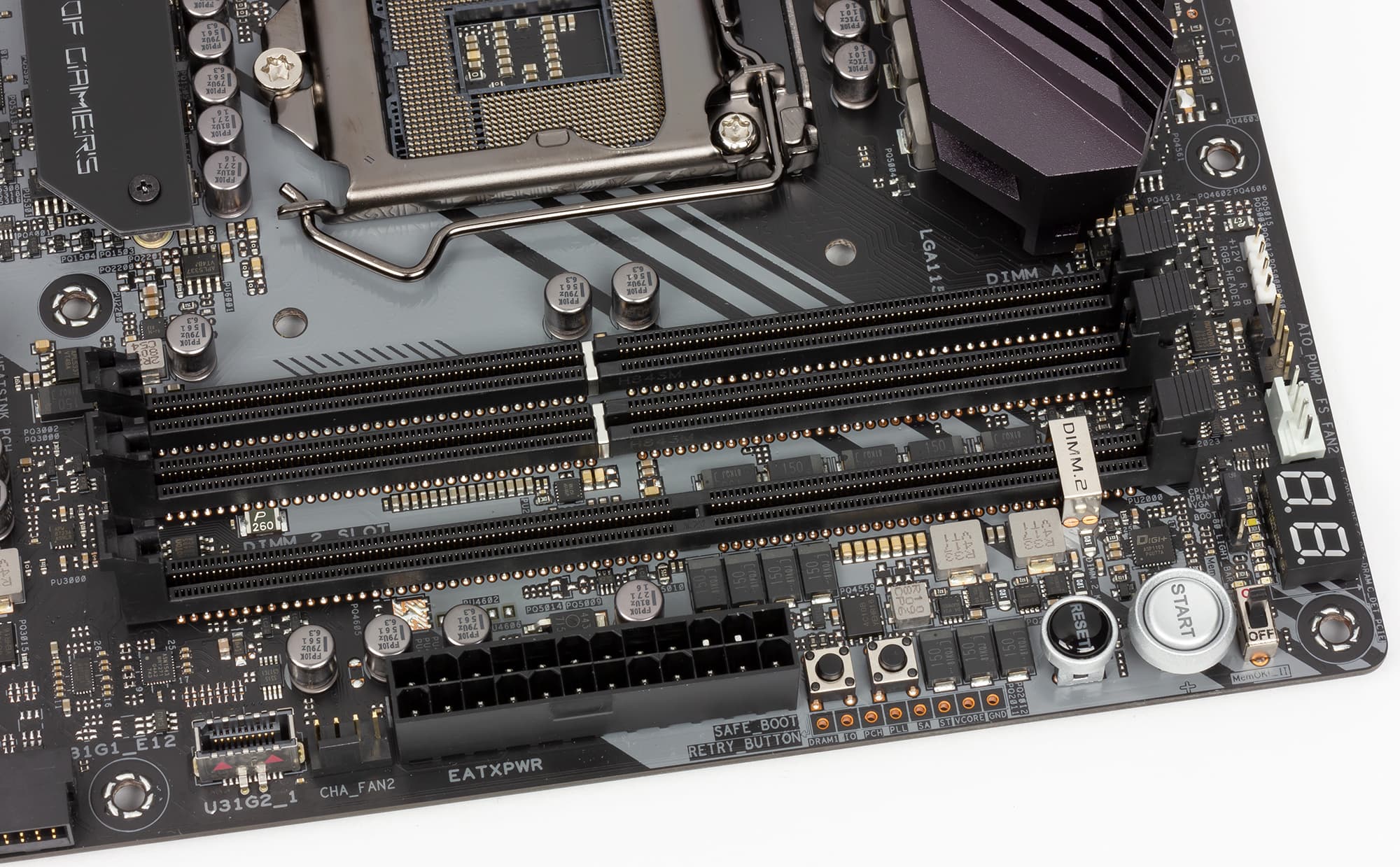 Поскольку плата Asus ROG Maximus XI Apex относится к топовому сегменту ROG, на ней реализовано большое количество различных дополнительных функций. Начнем с того, что есть кнопка включения (Start) и перезагрузки (Reset). Далее, на плате есть индикатор POST-кодов. Из кнопок есть еще Safe_Boot и Retry_Button. Кнопка Safe_Boot позволяет перезагружаться в безопасном режиме (Safe mode), что актуально при разгоне системы. Кнопка Retry_Button также используется при разгоне системы и нужна для того, чтобы перезагружать систему при ее разгоне с сохранением разгонных настроек в BIOS Setup. Еще одна кнопка на плате — BIOS Switch. Дело в том, что на плате Asus ROG Maximus XI Apex имеется две микросхемы BIOS и данная кнопка позволяет выбирать конкретную микросхему для загрузки системы.