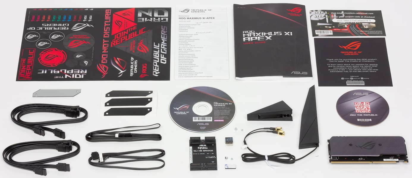 Комплект поставки включает четыре SATA-кабеля (все разъемы с защелками, два кабеля с угловым разъемом с одной стороны), руководство пользователя, DVD-диск с программным обеспечением и драйверами, мостик SLI на две видеокарты, антенну встроенного Wi-Fi-модуля, два кабеля-переходника для подключения светодиодных лент, плату ROG DIMM.2 на два M.2-накопителя и, конечно же, различные стикеры в большом изобилии.