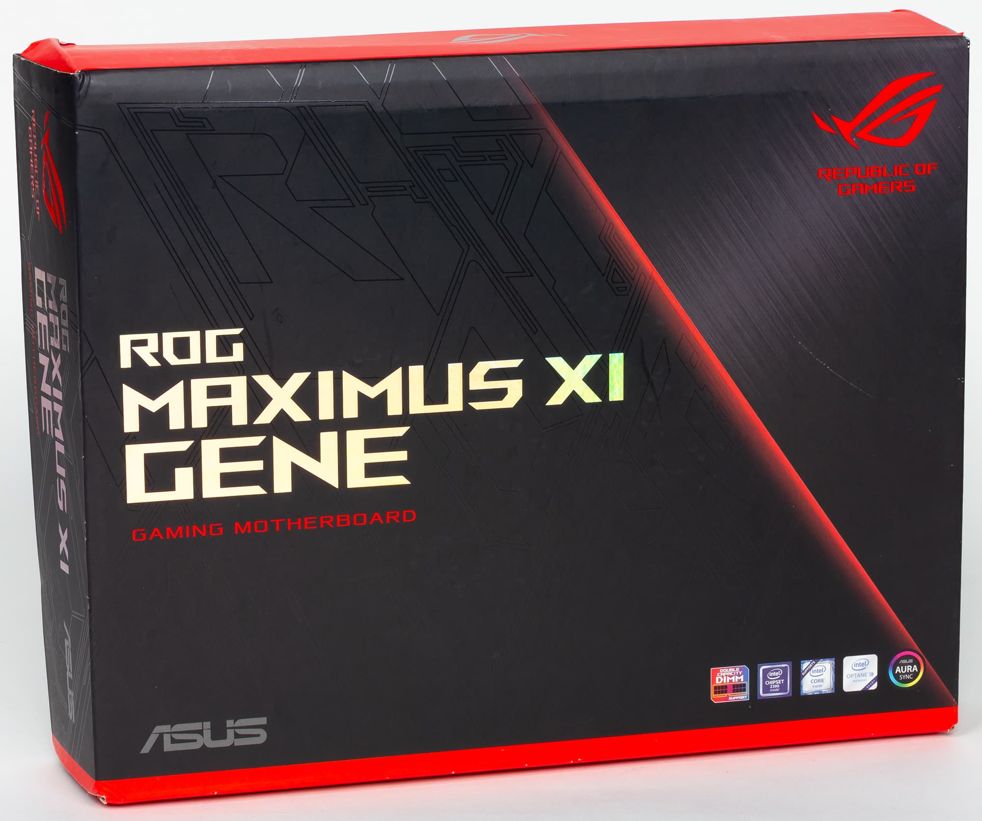 Плата ROG Maximus XI Gene поставляется в средней по размере коробке, оформленной в стандартном для серии ROG стиле.