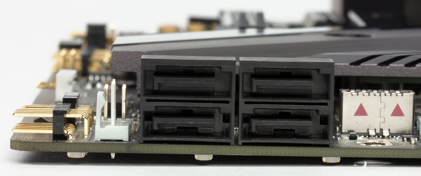 Для подключения накопителей или оптических приводов на плате предусмотрено четыре порта SATA 6 Гбит/с, которые реализованы на базе интегрированного в чипсет Intel Z390 контроллера. Эти порты поддерживают возможность создания RAID-массивов уровней 0, 1, 5, 10.