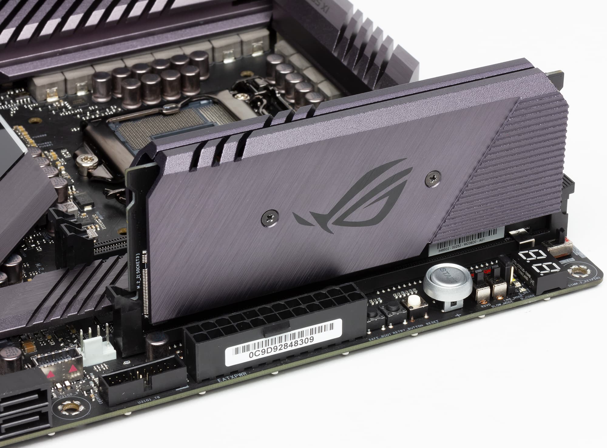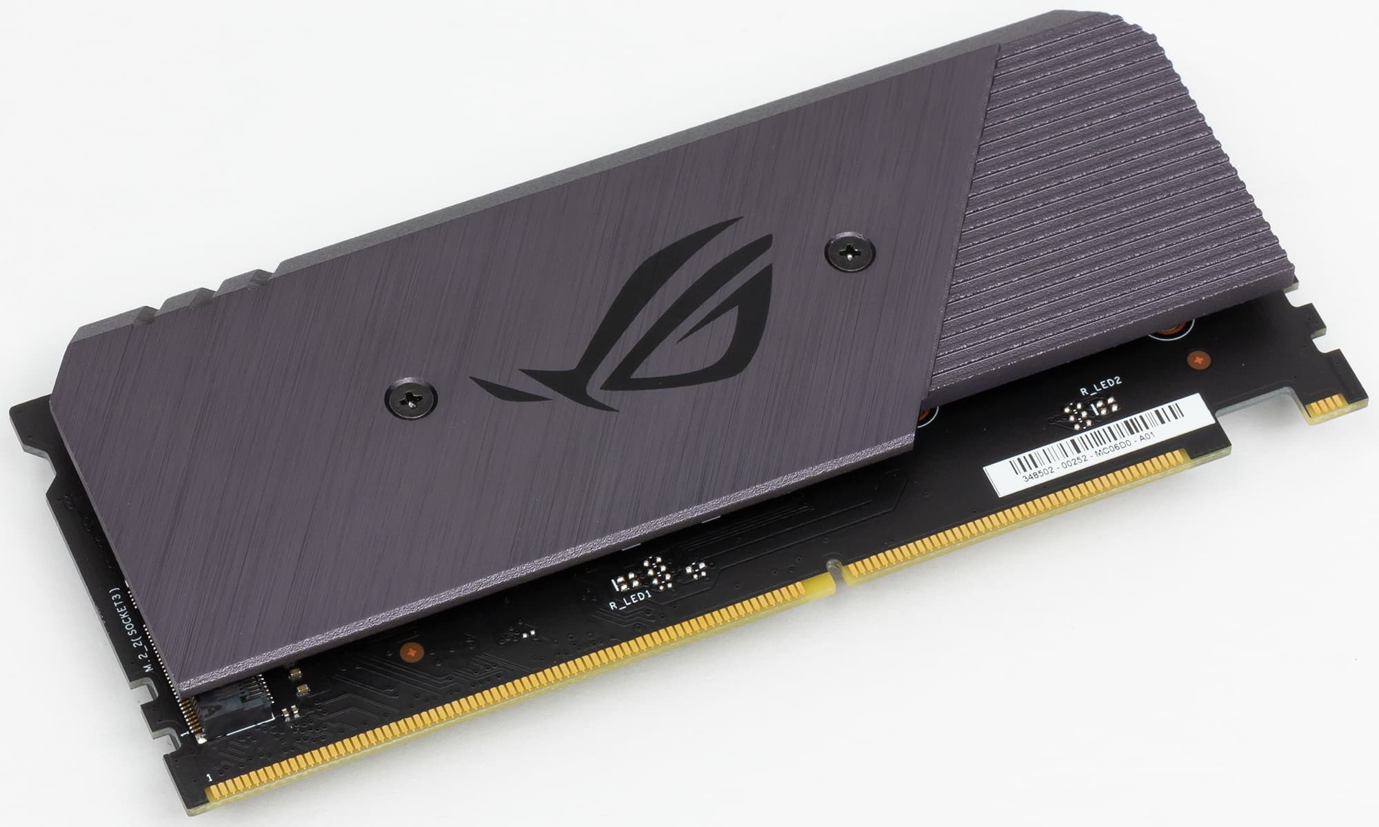 Слот ROG DIMM.2 также реализован на базе процессорных линий PCIe 3.0. Этот слот предназначен для установки фирменного модуля с двумя разъемами M.2. Разъемы M.2 на модуле ROG DIMM.2 поддерживают накопители только с интерфейсом PCIe 3.0 x4 (типоразмера 2242/2260/2280/22110), и, соответственно, для слота ROG DIMM.2 требуется всего 8 линий PCIe 3.0. Для SSD-накопителей, устанавливаемых в модуль ROG DIMM.2, предусмотрены радиаторы.