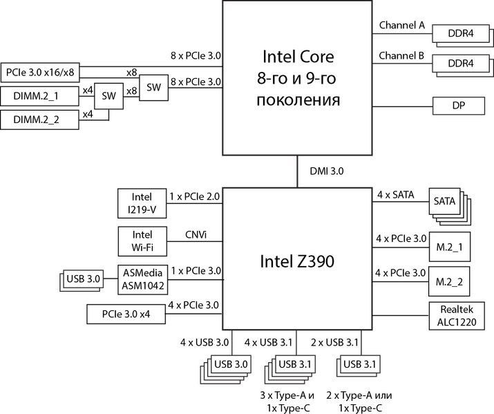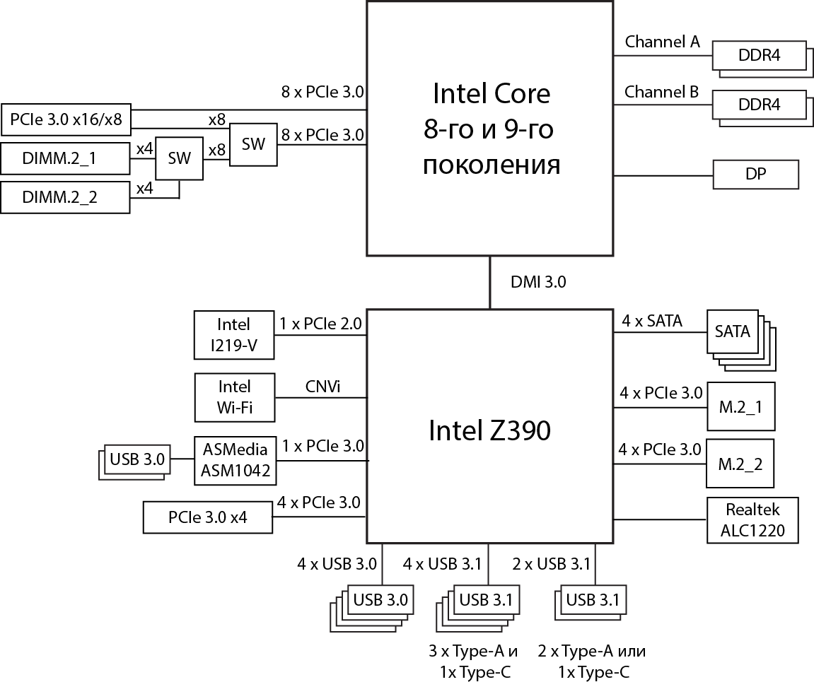 | Поддерживаемые процессоры | Intel Core 8-го и 9-го поколения |